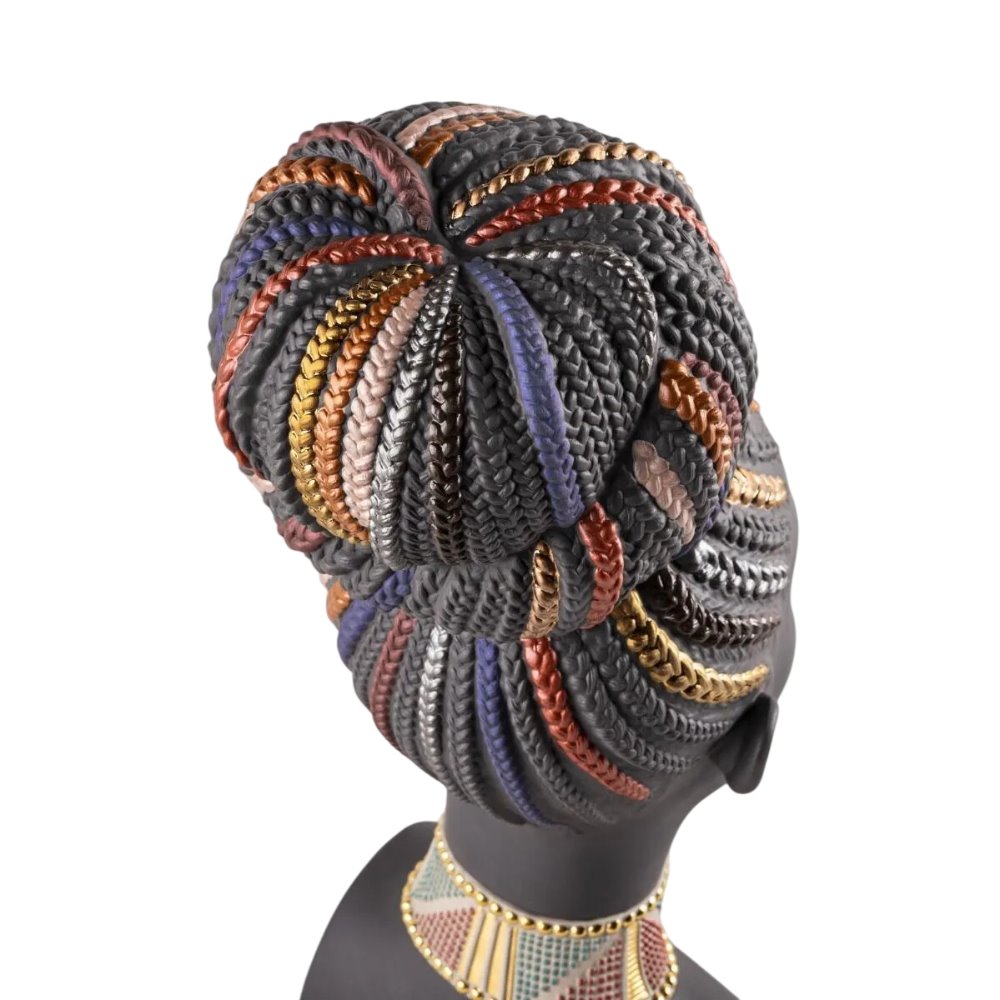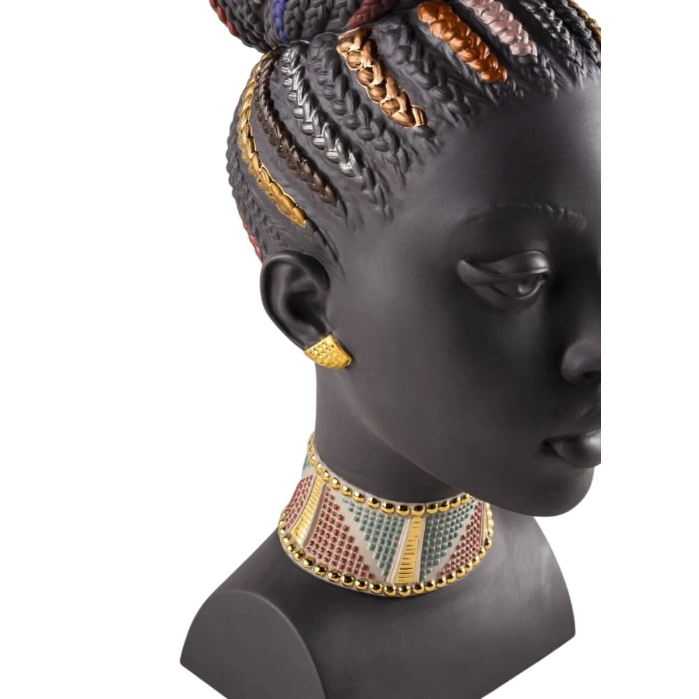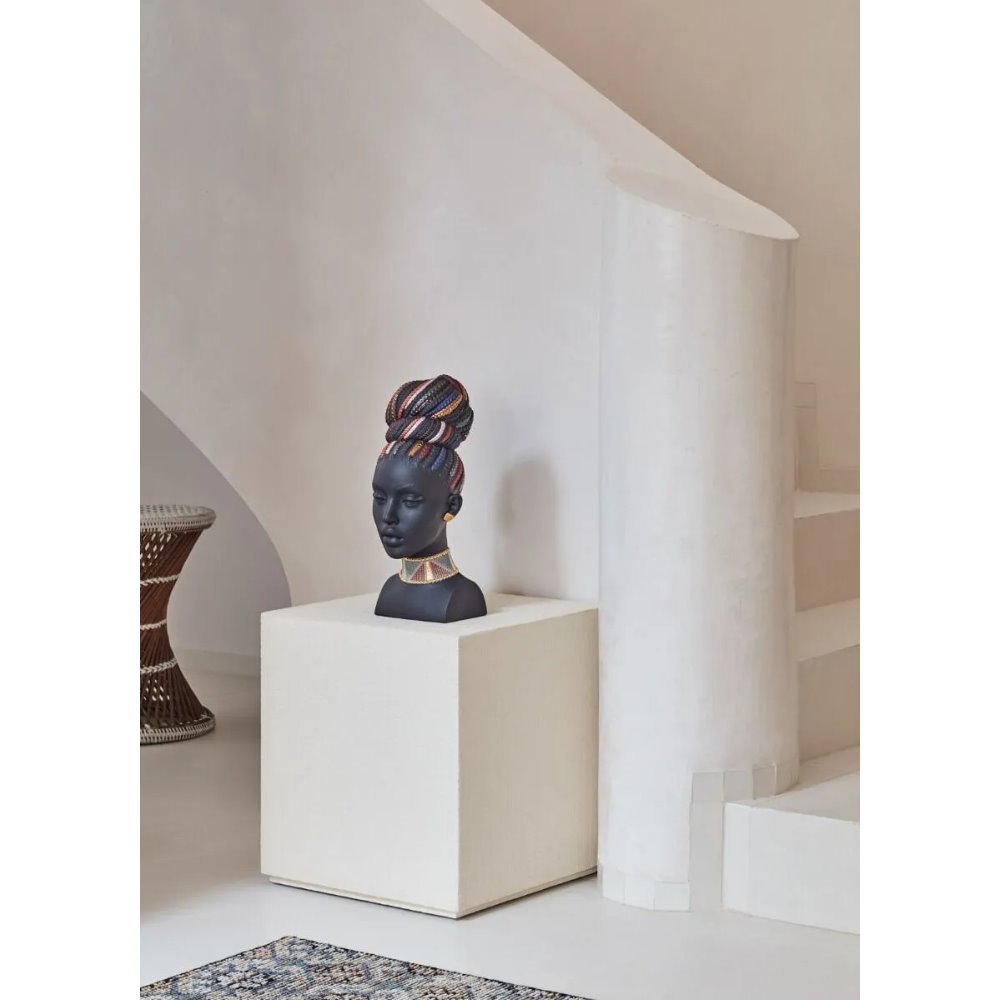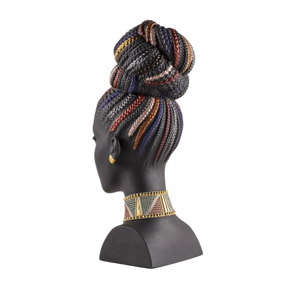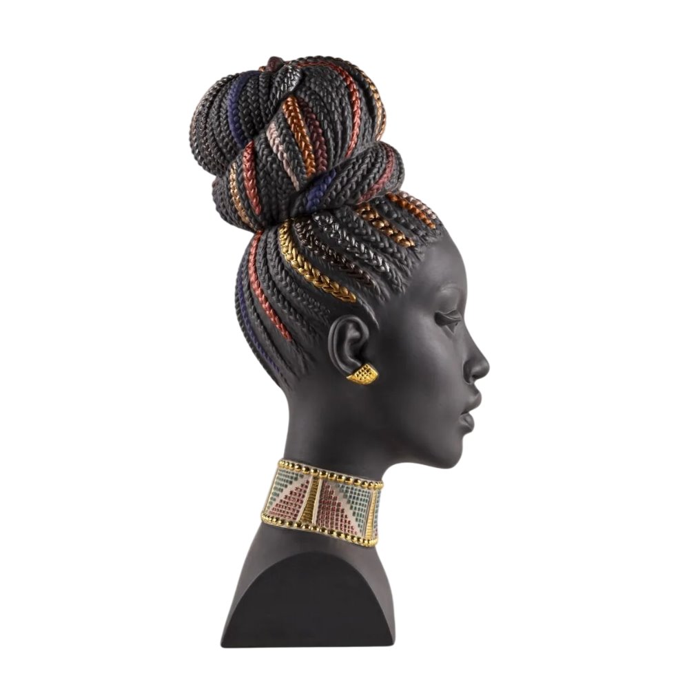 Questo busto femminile è realizzato in porcellana nera opaca e prende ispirazione dalla cultura africana, dal suo simbolismo e dal suo intenso colore. I tratti sereni del suo volto, scolpiti magistralmente, si completano con la decorazione con riflessi dorati e colori metallizzati.