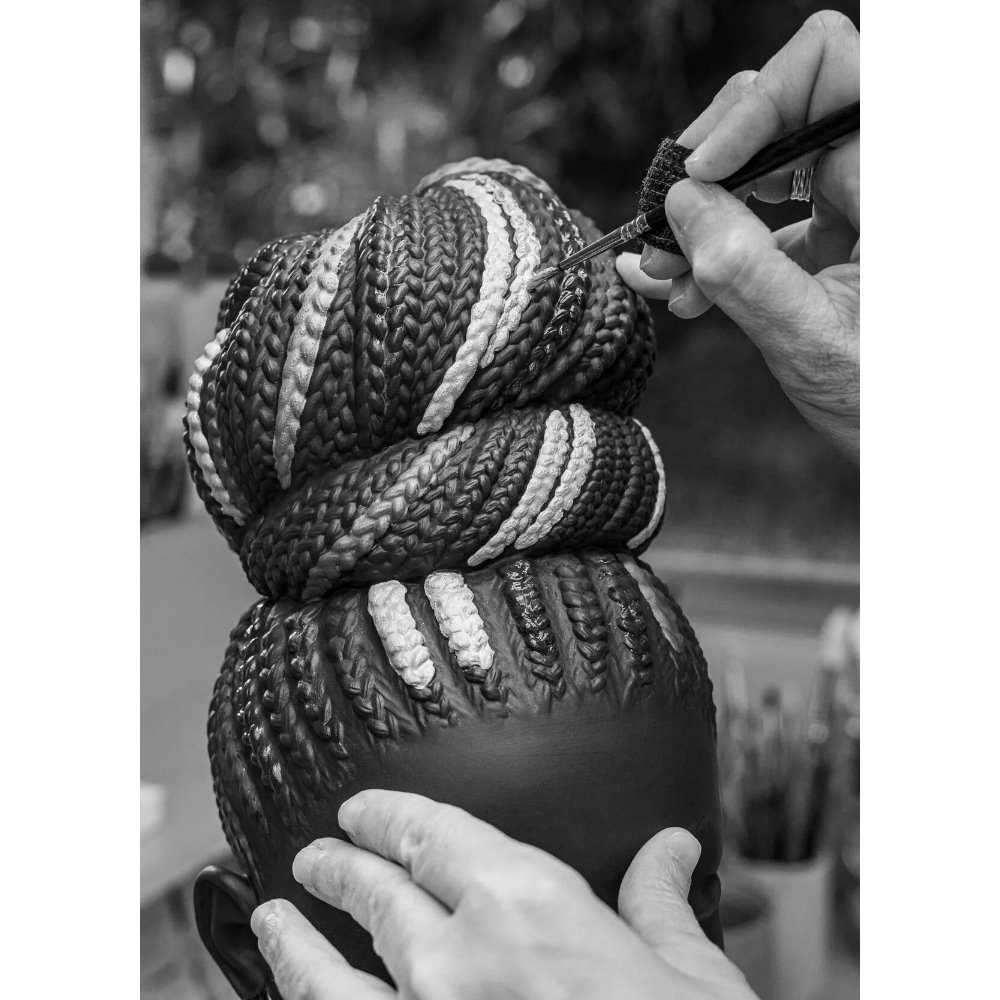 Risaltano in modo particolare i dettagli incisi su orecchini e collana e il lavoro ornamentale realizzato per ricreare la ricchezza dell'intreccio dei capelli. Ne risulta una creazione di grande forza espressiva, che richiama il carattere dell'arte africana.