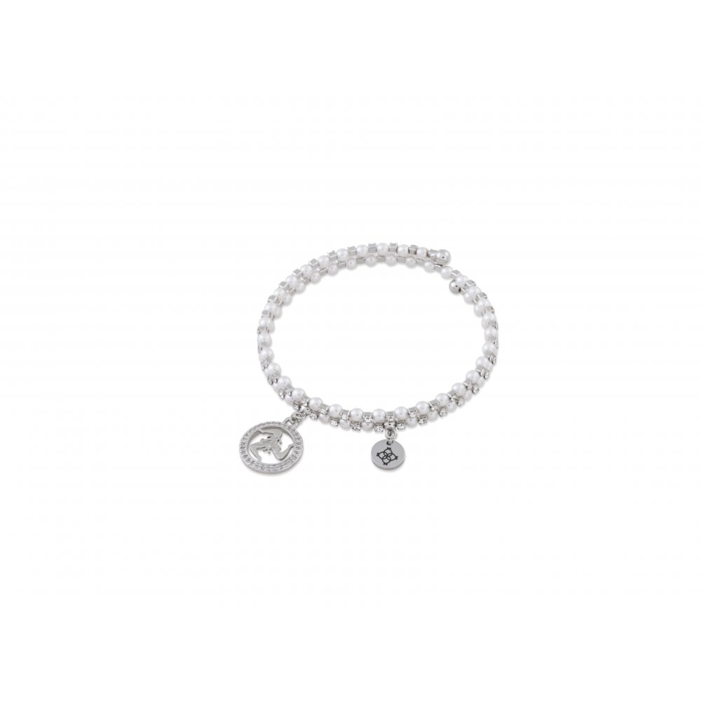 Frühlingsarmband mit Perlen und Strasssteinen. Ein einzigartiges Damenjuwel mit der ikonischen Trinacria. Material: Messing mit Perlen und Strasssteinen Oberfläche: Rhodium Anhänger: Durchbrochen mit Strasssteinen Anhängermaterial: Messing Anhängergröße: ø 15 mm