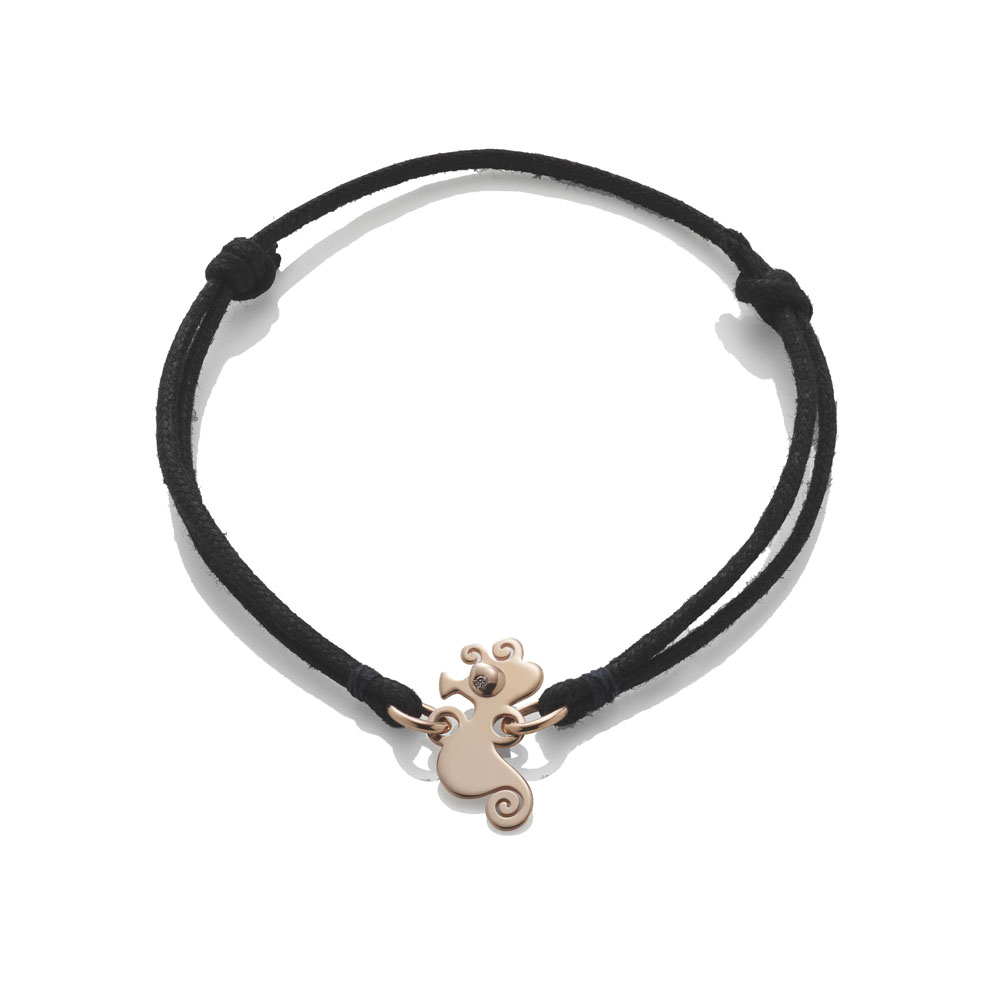 Kleines Pferdearmband aus 9 Kt Roségold, Augen mit Diamant und schwarzer Schleifenschnur.