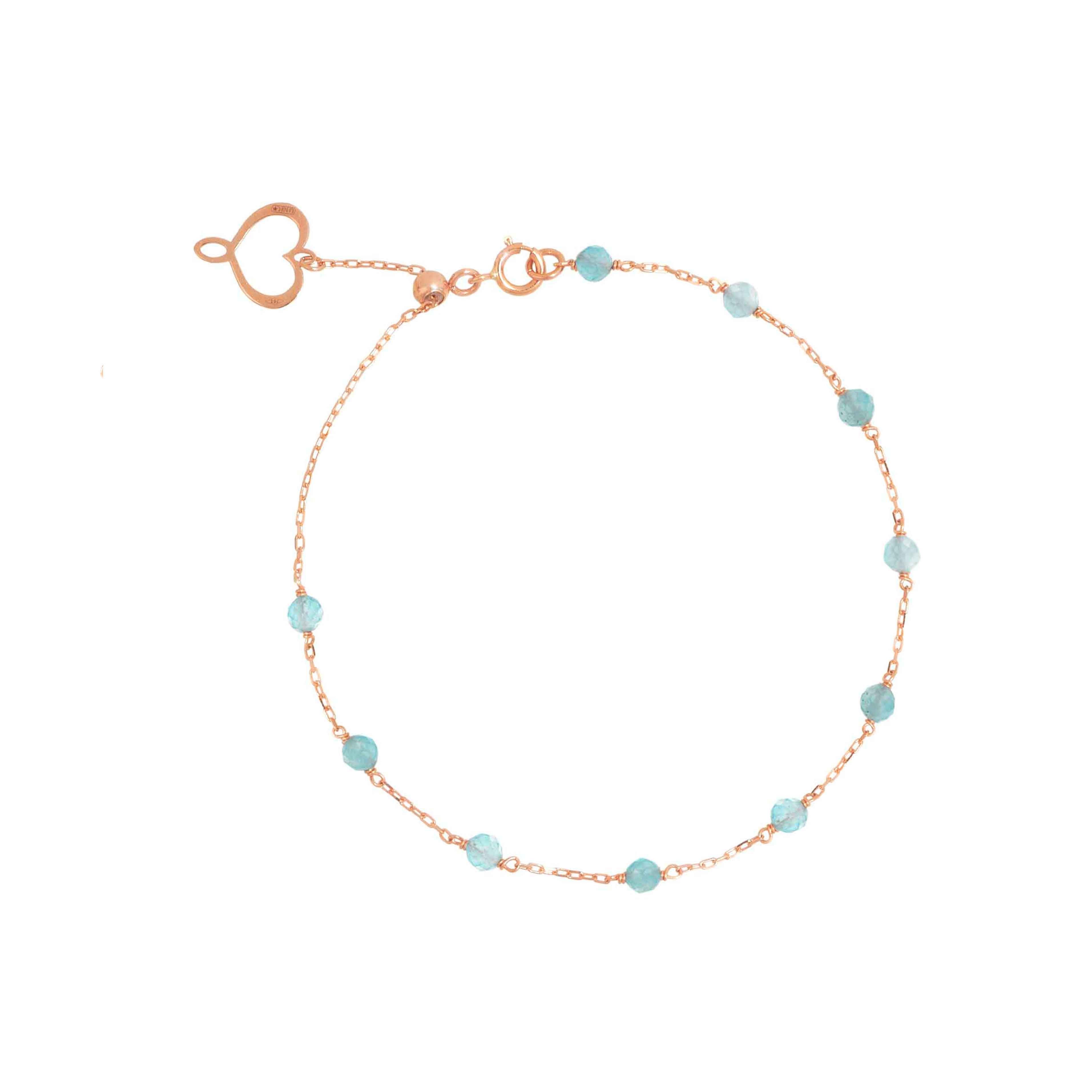 Bracciale Aurum realizzato in oro rosa 18 carati con catena e pietre di Acquamarina. Il bracciale può essere regolato da un minimo di 14 cm fino ad un massimo di 18 cm, grazie alla sfera scorrevole. Chiusura con anello a molla. Significato della pietra. Secondo una leggenda, l’Acquamarina è ritenuta la pietra dei marinai e dei viaggiatori, secondo altre, invece, è propiziatrice di matrimoni felici. Sarebbe consigliabile quindi, donare questa pietra il giorno delle nozze. Alcune tonalità di colore dell’Acquamarina ricordano quelle del cielo, ed essendo questo considerato fonte d’illuminazione si pensa che la pietra possa confortare e dare speranza a colui che attraversa momenti dolorosi della sua vita. Nota: Le pietre impiegate per i gioielli Aurum, sono naturali. Per questo motivo potrebbero variare nelle sfumature.