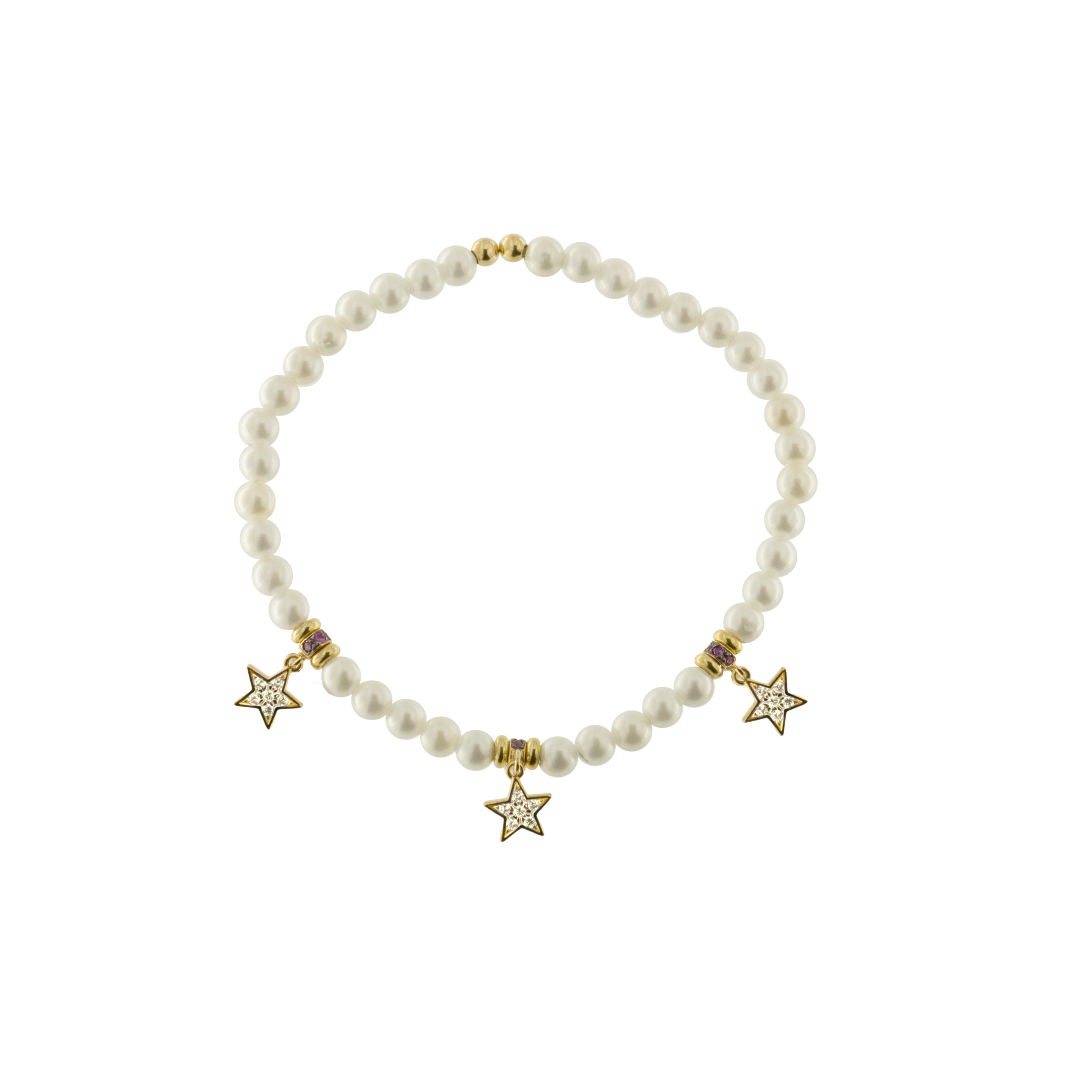 Bracciale elastico perle di conchiglia con tre stelle zirconi bianchi.