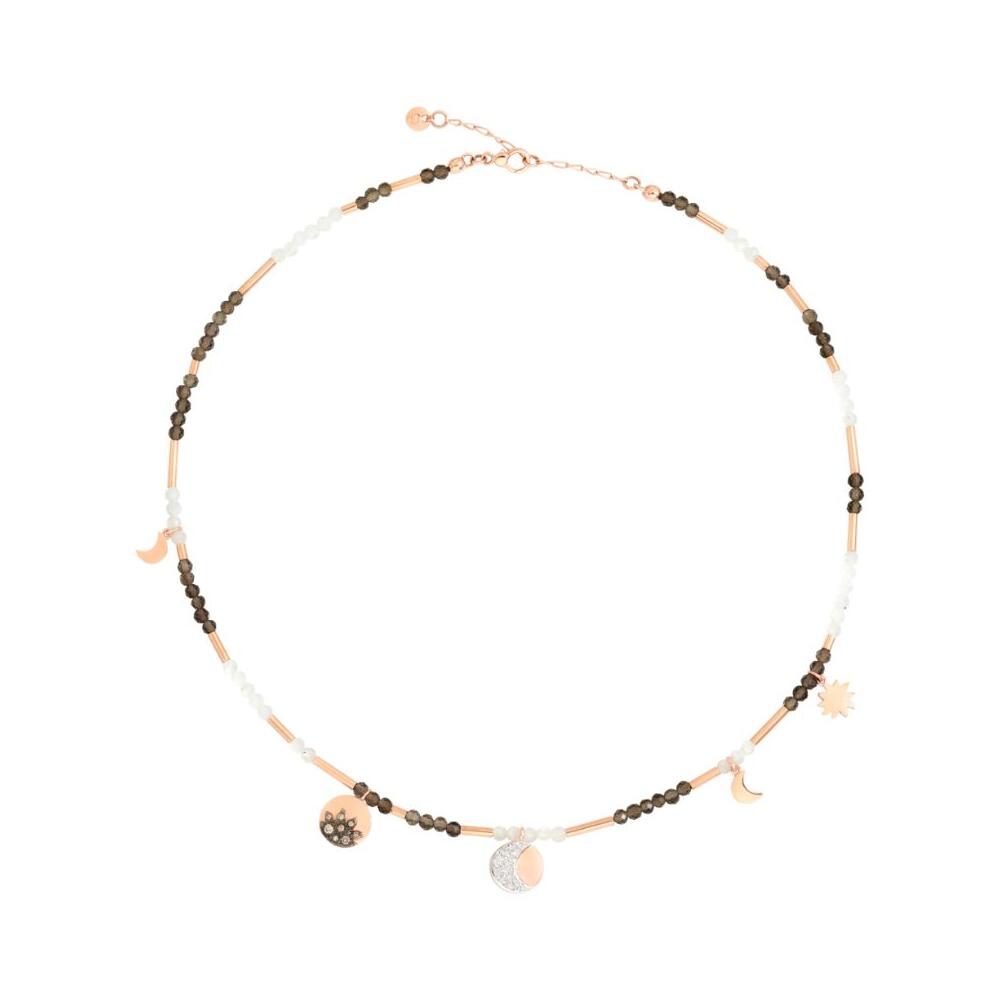 Collana Moon & Sun In Oro Rosa 9k Con Quarzo Fumè, Adularia, 13 Diamanti Bianchi, 8 Diamanti Brown E 3 Ciondoli Mini Icon In Oro Rosa 9k (0.17).