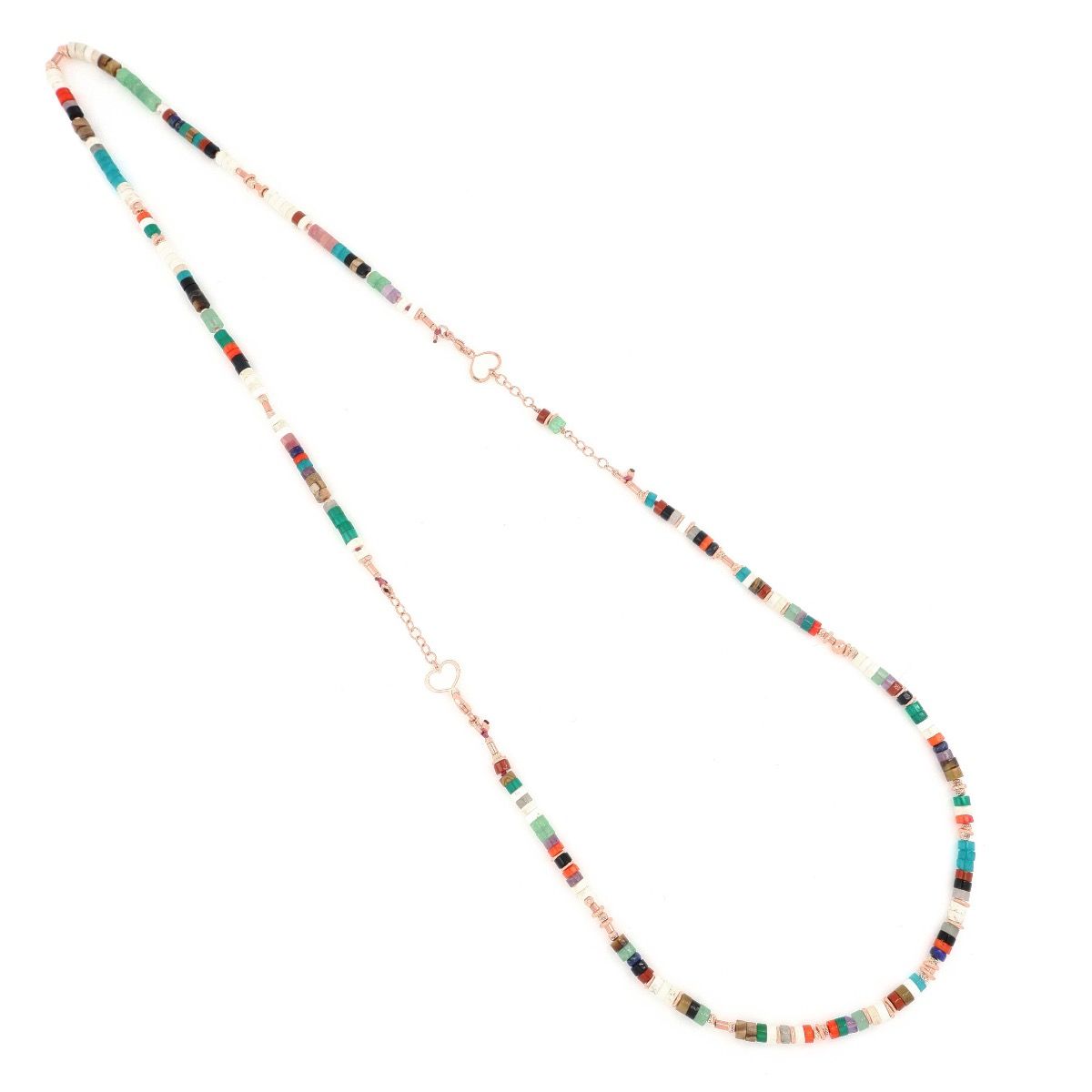 Può essere indossata come collana lunga di 73 cm oppure, sganciando i due moschettoni, si ottengono due girocolli.