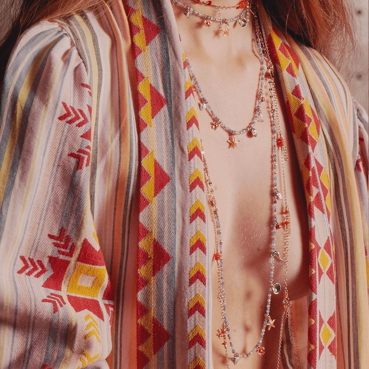 I charms presenti lungo la parte con pietre sono: due denti di squalo argento, una coccinella con goccia di Rubellite, due pesci argento con goccia di Tanzanite, una conchiglia brunita con Perla, una stella marina rossa con goccia di Rubellite, un fiore rosso tridimensionale, un corallo rosso con goccia di Tanzanite.