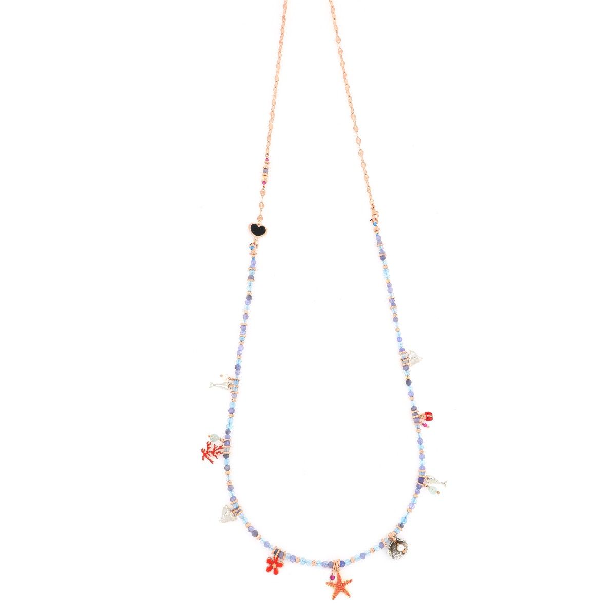 Collana lunga azzurra con charms tridimensionali del mondo marino realizzata in argento 925 con galvanica oro rosa ad alto spessore e resistenza.