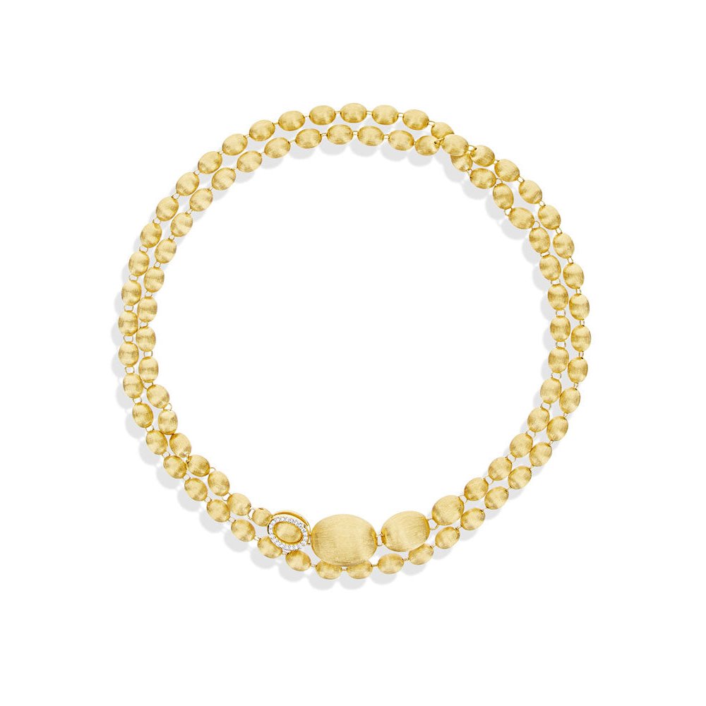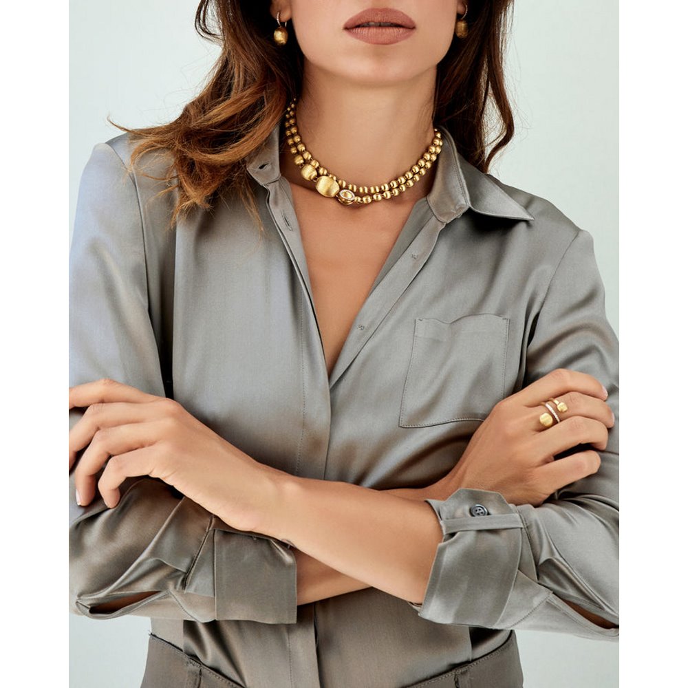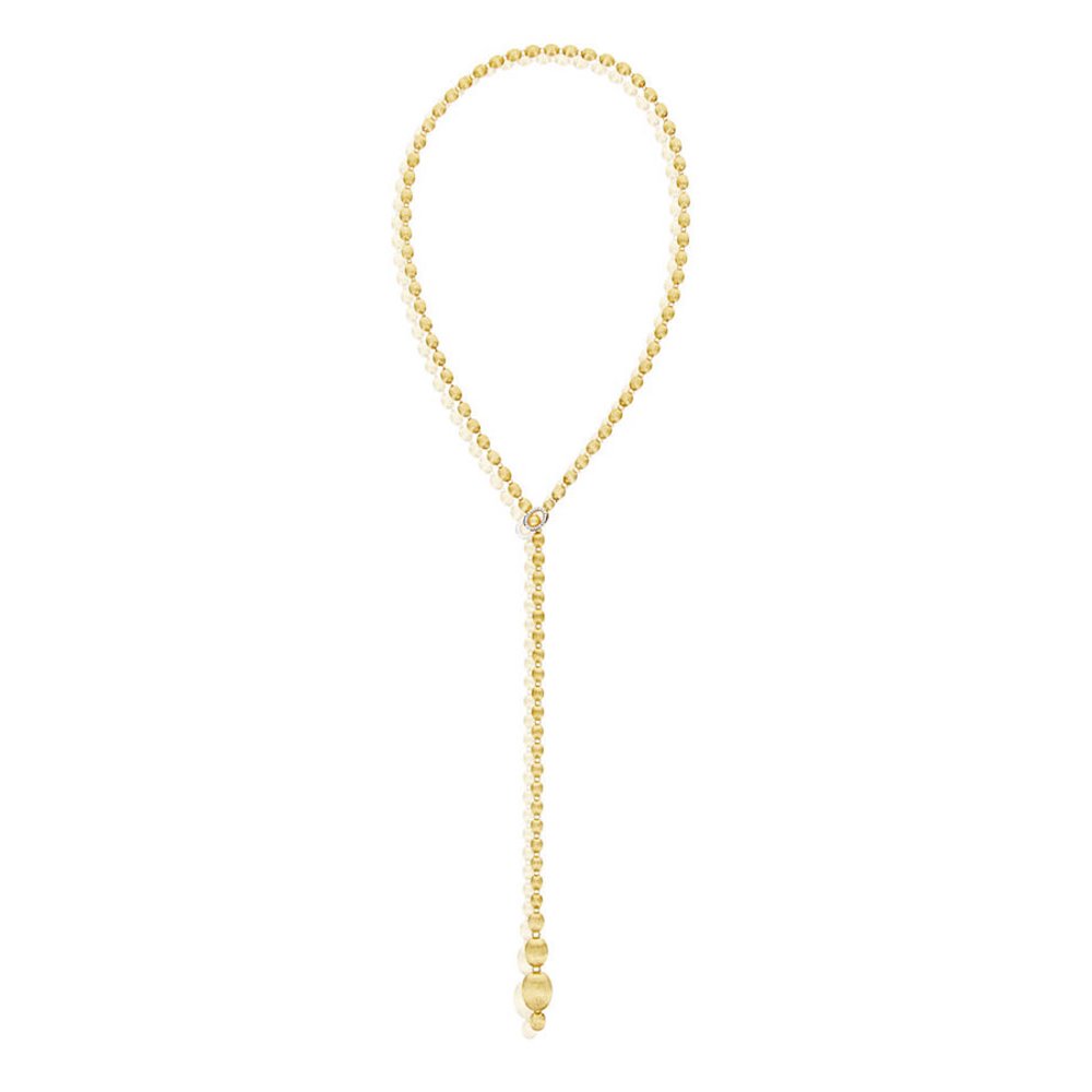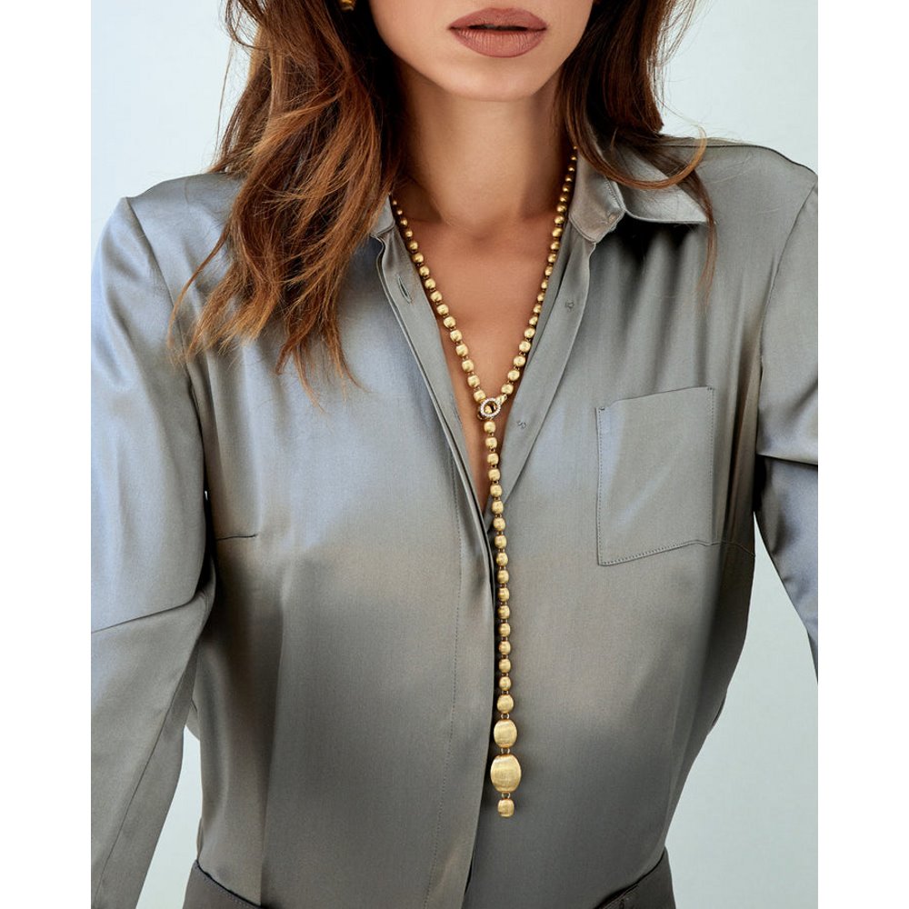 Hier ist die Perlenkette von Nanis: 18 Karat Goldkugeln, einzeln von Hand graviert, die in einem Diamantverschluss gipfeln, der bereit ist, jede einzelne Kugel dieses Juwels zu umschließen und ihm seine unendlichen Möglichkeiten zu eröffnen. Diese Kette aus goldenen Perlen kann tatsächlich zu einem sinnlichen Halsband werden, aber auch zu einem klassischen Chanel oder einem transgressiven Lariot. Interpretieren Sie es entsprechend Ihrem Aussehen und Ihrer Persönlichkeit! Ref. CS34-538 Länge 80,00 cm lang getragen DIAMANTEN: - Gewicht (gesamt): 0,25 CT - Reinheit: VS - Farbe: G - Schliff: runder Brillant