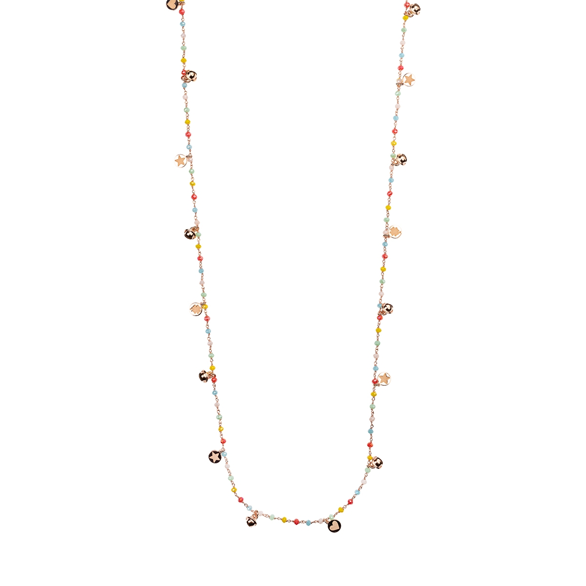 Il gioiello è in argento 925‰ con finitura in oro rosa 18Kt con pietre miste pastello, 8 campanellini e 9 medagliette a forma di cuore, stella e quadrifoglio.