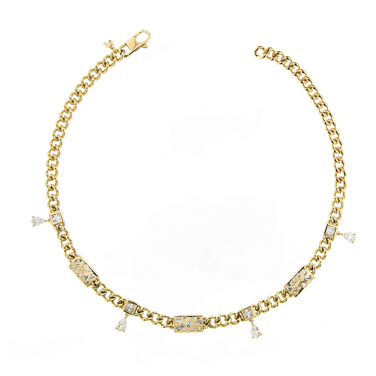 Girocollo con catena groumette bold, placca in argento bagnato in oro 18 kt intervallato da luminose pietre cubic zirconia bianco con tagli e sfaccettature diverse e pendenti con pietra taglio goccia