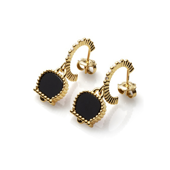 Kleine Kreisohrringe aus 18 kt Gelbgold und Diamanten, kleine Glocke aus Onyx
