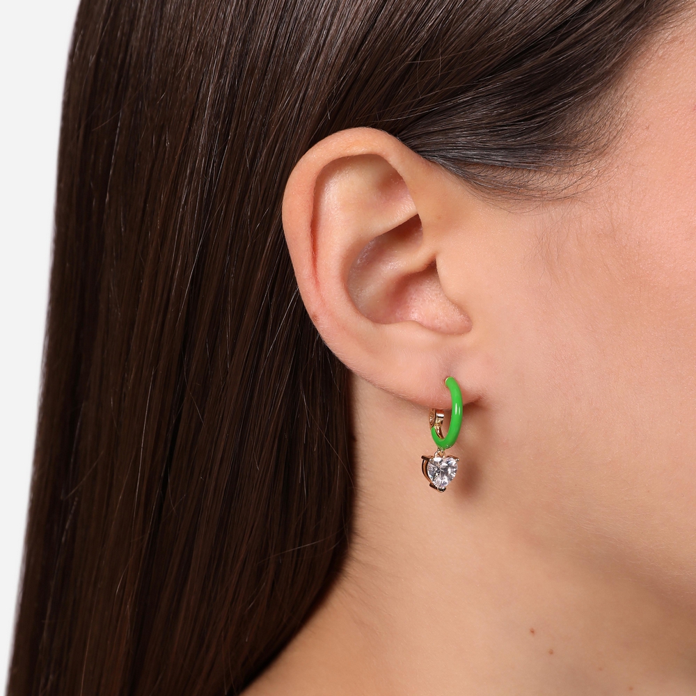 Orecchini a cerchio placcati oro 18kt con smalto azzurro e zircone bianco a forma di cuore pendente.