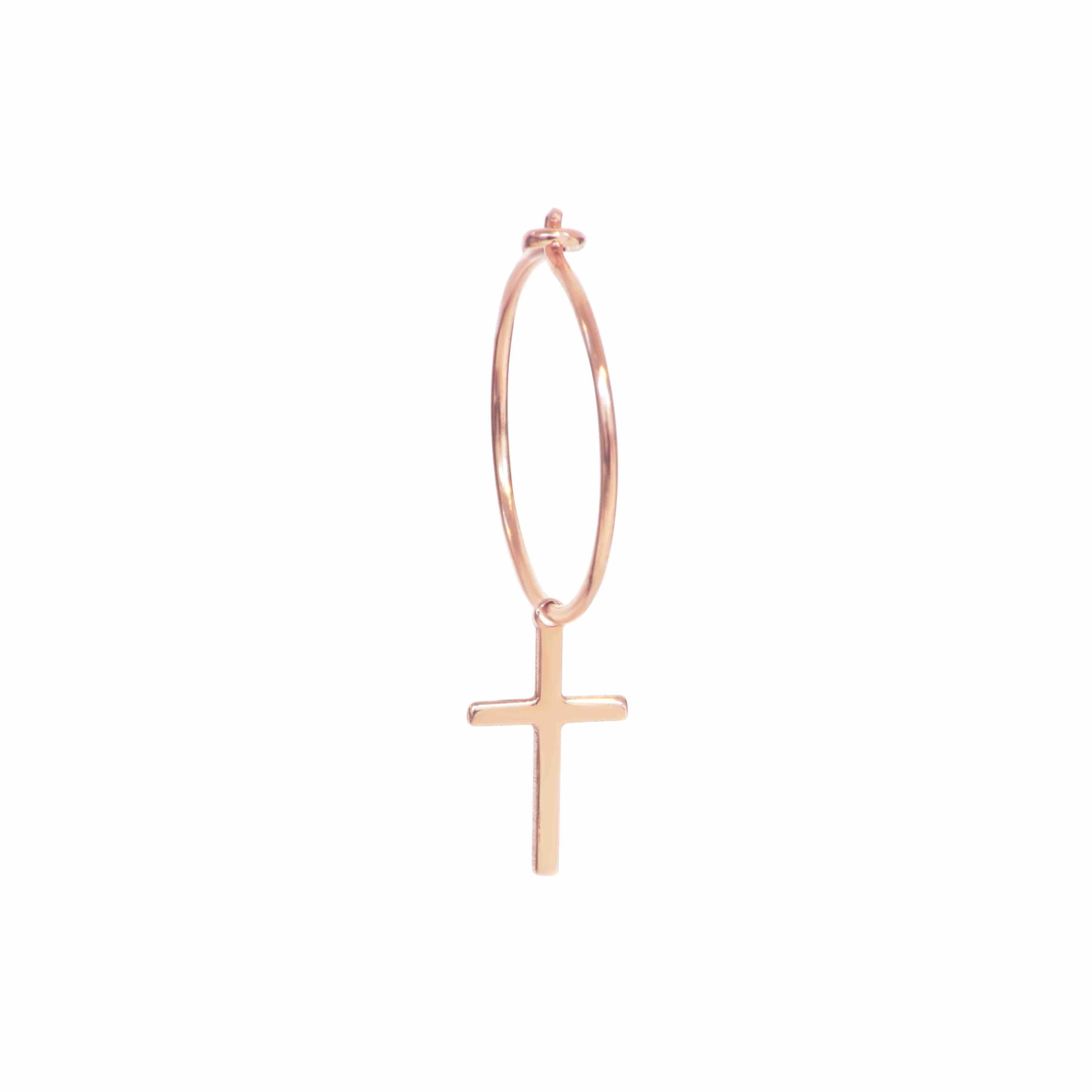 Orecchino a cerchio singolo della Collezione Aurum con sagoma di croce lastra. La croce misura 6,5 mm x 10 mm (H). Il cerchio misura 13 mm di diametro.