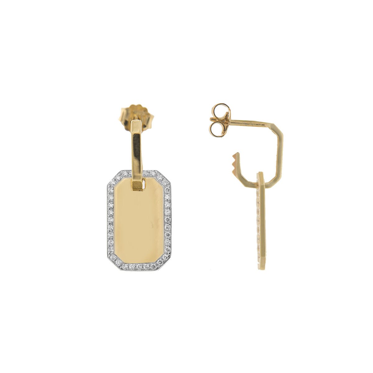 Mono-Ohrring mit quadratischem Kreis und Mini-Nieten auf der Rückseite. Der Anhänger ist eine rechteckige Medaille mit glatter Textur und Umriss aus weißen Zirkonen. Perfekt für Gravuren. Die Medaille ist 1,8 cm lang und 0,6 cm breit. Das quadratische Stirnband hat einen Durchmesser von 1,2 cm. Verfügbares Finish: 18 Karat Gelbgoldbeschichtung. Material: 925 Silber.