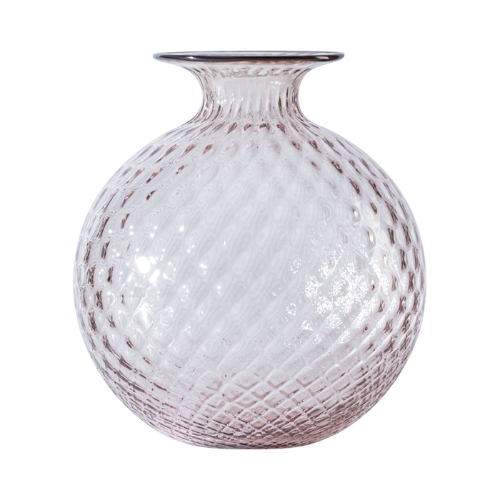 Sembra morbido, eppure è vetro. L'illusione ottica del Monofiori di VENINI del 1970 è nel suo nome: Balloton, la lavorazione unica che ricrea sulla superficie l'effetto matelassé. L'opera è lavorata a mano, soffiata nel caratteristico stampo in metallo e finita nel collo sottile con un filo colorato applicato a caldo, che varia nel colore.