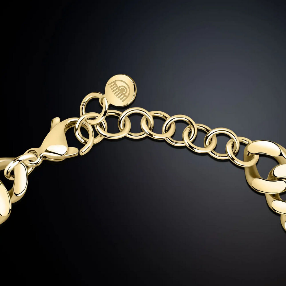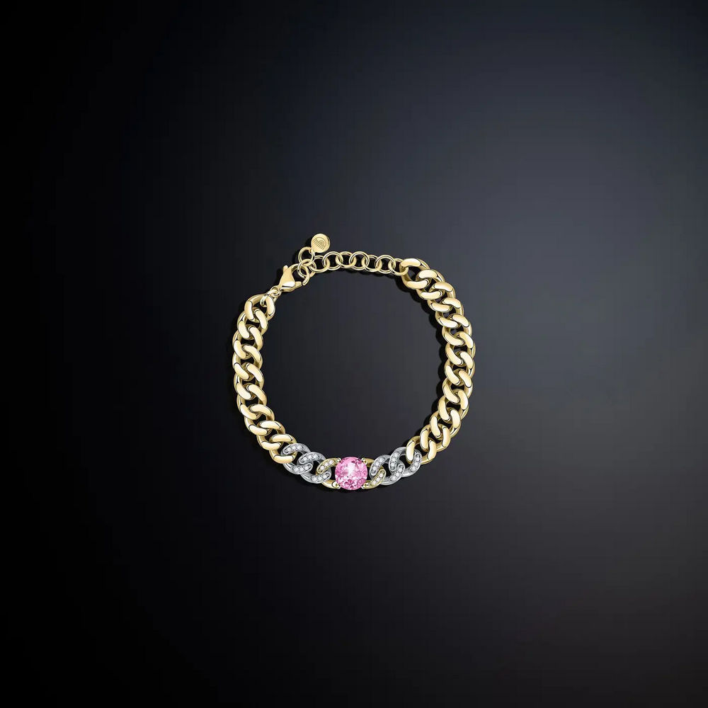 Bracciale da Donna, collezione Chain Chiara Ferragni. Bracciale catena groumette placcata oro giallo 18 kt con zircone rosa fata centrale taglio rotondo e pavè di zirconi bianchi.