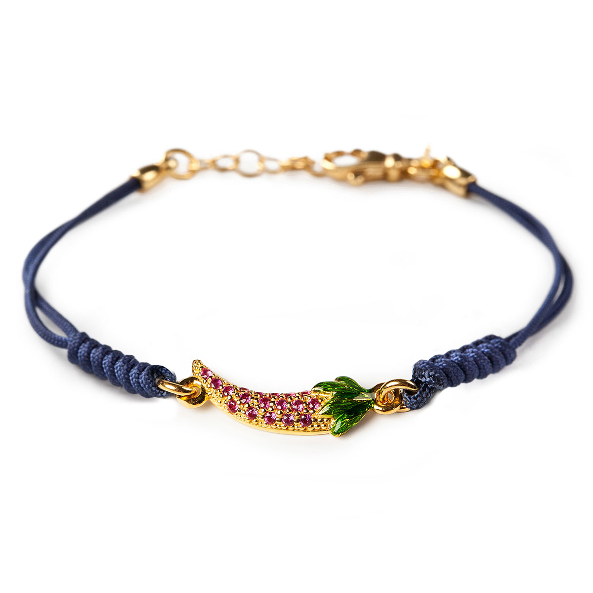 Bracciale in argento 925, placcato oro, smalti, Cubic Zirconia e cordino in tessuto annodato a mano anallergico con chiusura estendibile.