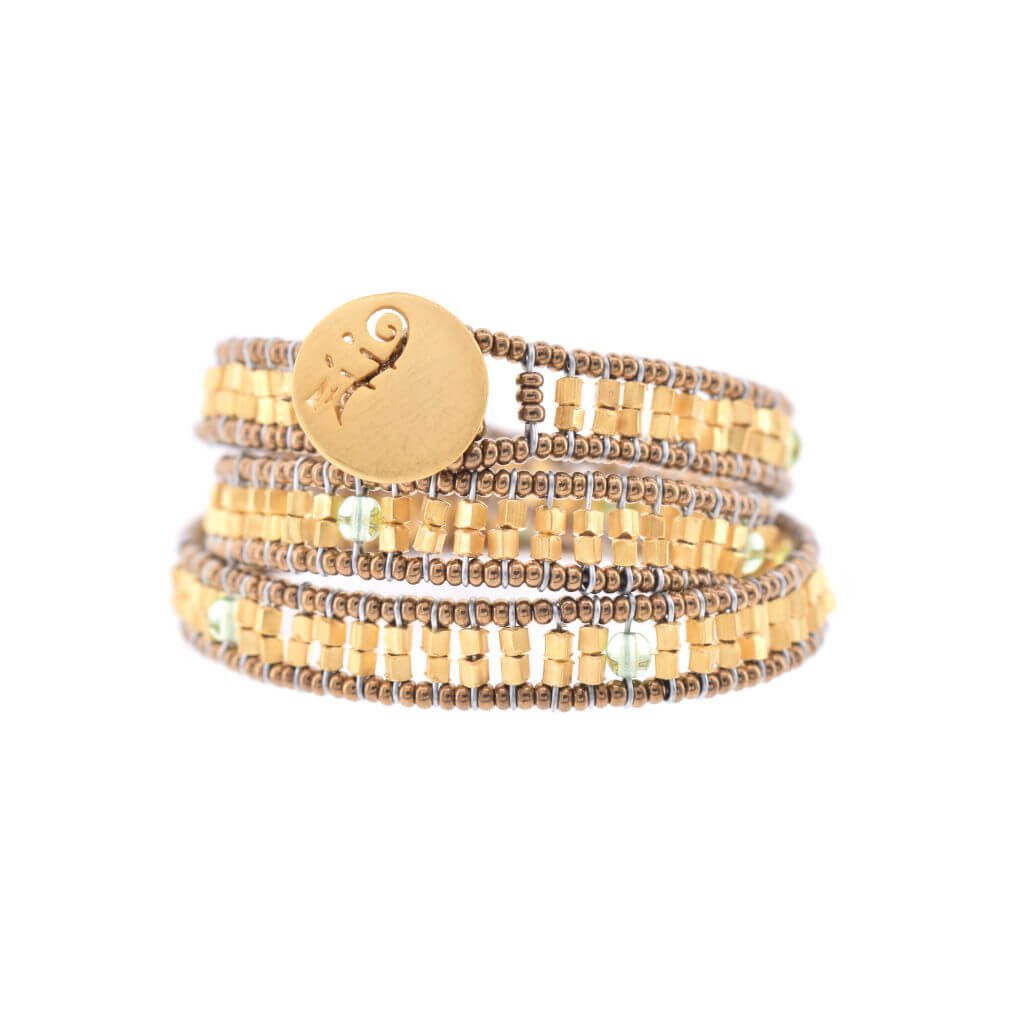 The Bombay Boa Green bracelet is 54 cm long. This length allows you to wrap it three times around your wrist. Small gold-plated brass beads are flanked by light green glass beads. The bracelet is adjustable thanks to the Ziio cufflink. The composition of the Bombay Boa Green bracelet: Gold-plated brass, Murano glass beads. Original, Authentic, Artisan. “Ziio is as unique as every woman who wears it”