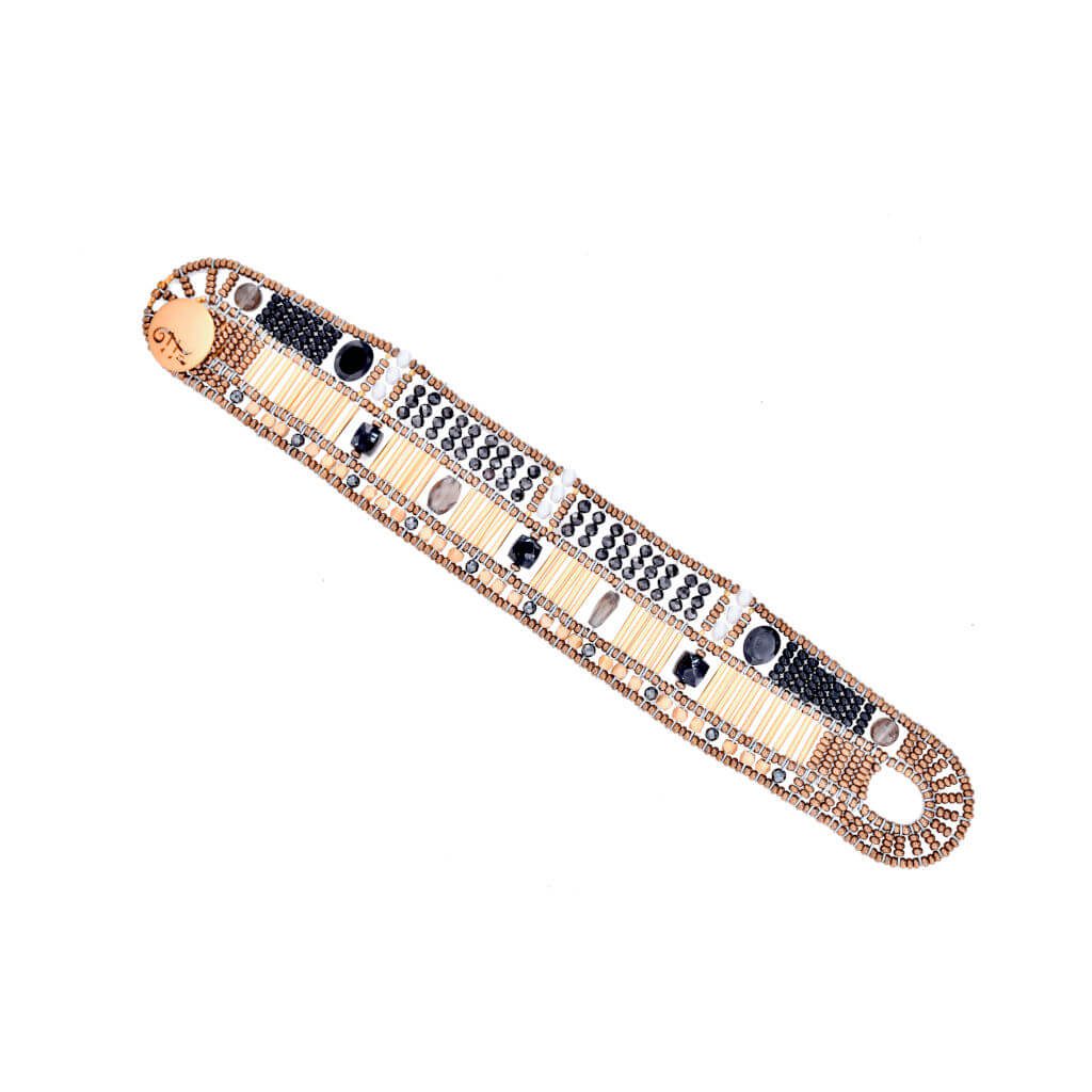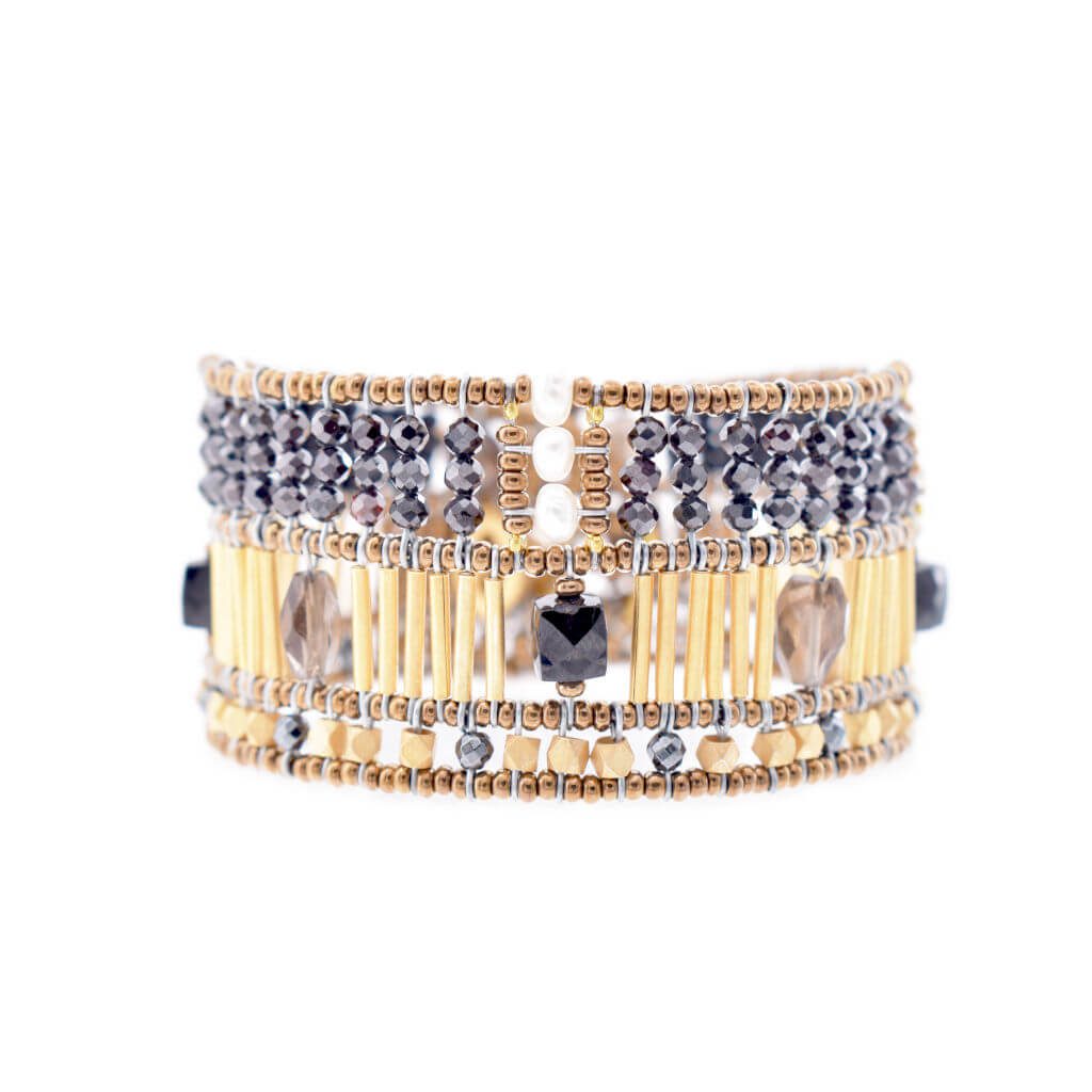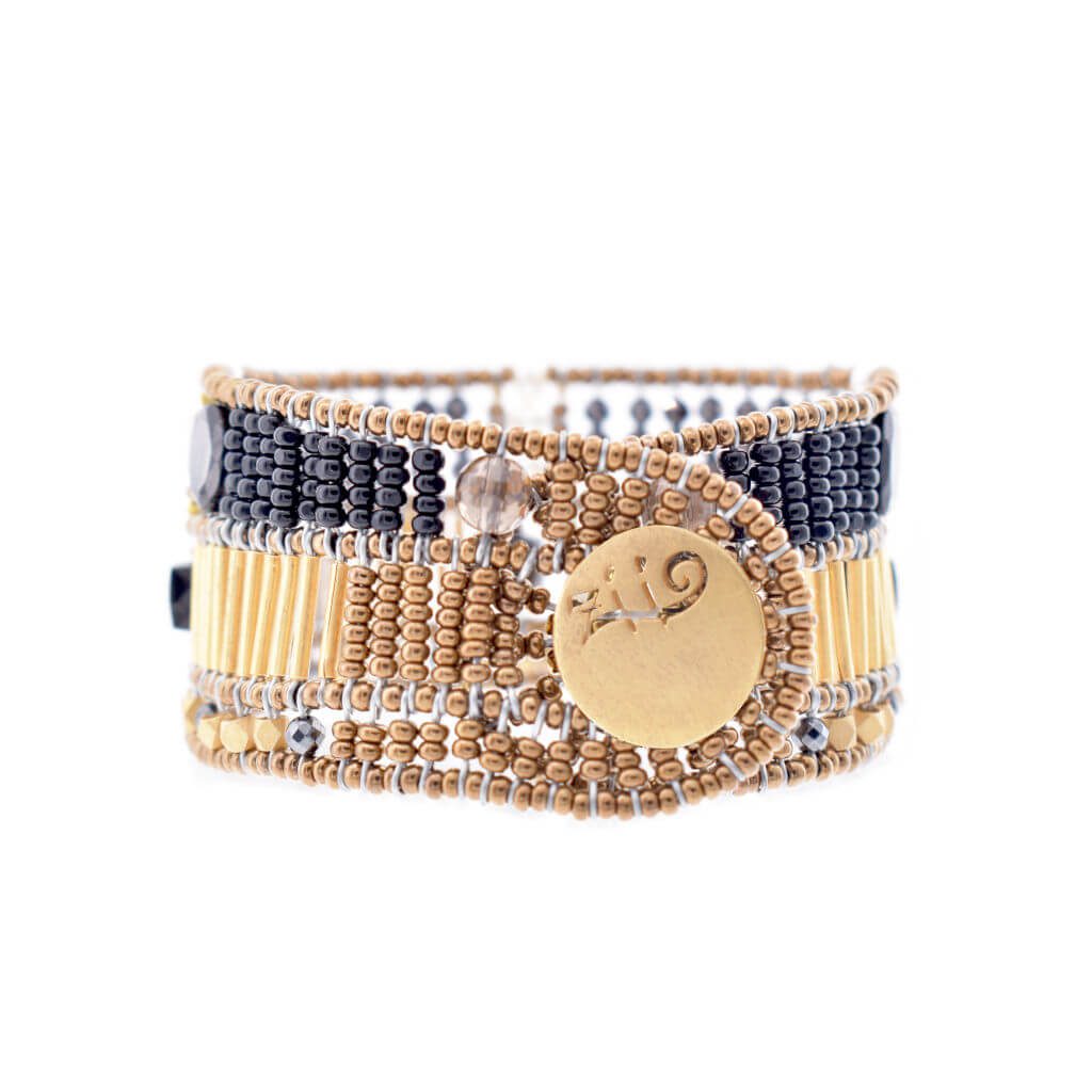 The Doree Black Small bracelet is a medium sized Ziio bracelet. In the center, golden brass beads divide oval gray quartz stones and square onyx stones. Below, discover the hematite stones among the small faceted gold-plated brass beads. At the top, freshwater pearls separate two rows of black zircons. Each side is decorated with a round gray quartz bead and an oval spinel bead. Composition: Gold plated brass, Hematite, Murano glass pearls, Onyx, Quartz, Water pearl. Original, Authentic, Artisan. “Ziio is as unique as every woman who wears it”