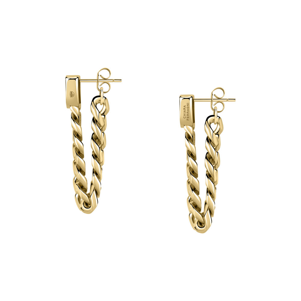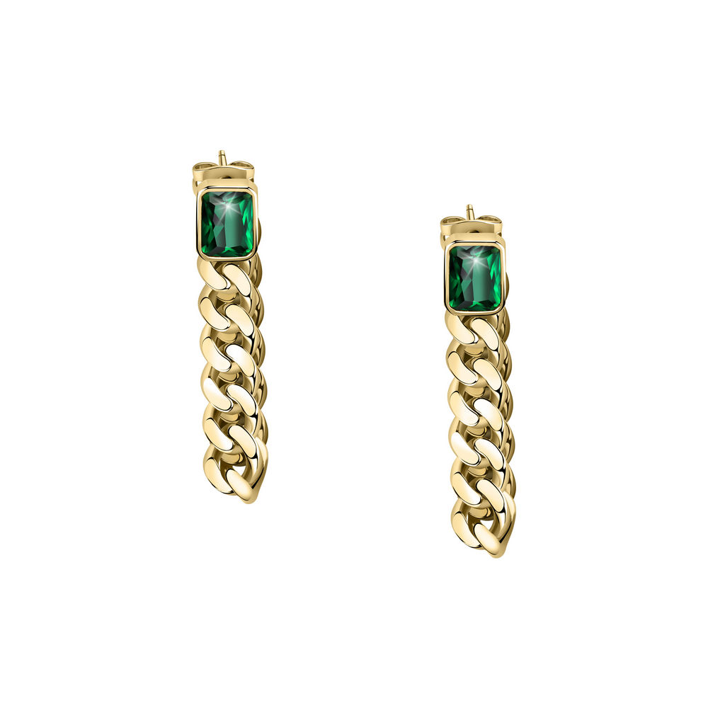 Orecchini da Donna, collezione Chain Chiara Ferragni. Orecchini catena groumette pendenti placcati oro giallo 18 kt e zircone verde taglio rettangolare.