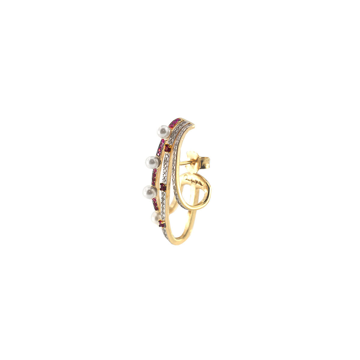 Mono-orecchino huggie con tre fili di zirconi bianchi, rossi e perle di conchiglia micro size. L'orecchino ha il perno centrale e i tre fili di zirconi e perle "abbracciano" il lobo.