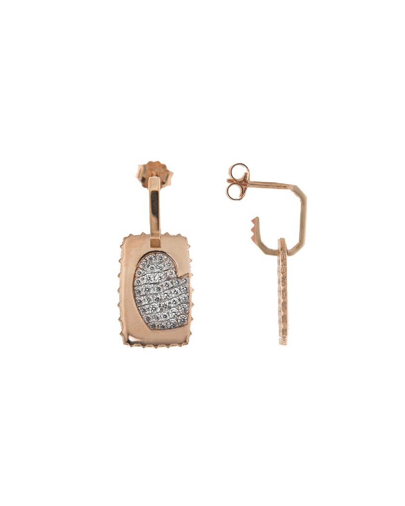 Mono-earring with squared circle and mini studs in the back, the pendant is a rectangular medal with a heart in white zircons and outline of mini studs on the sides.