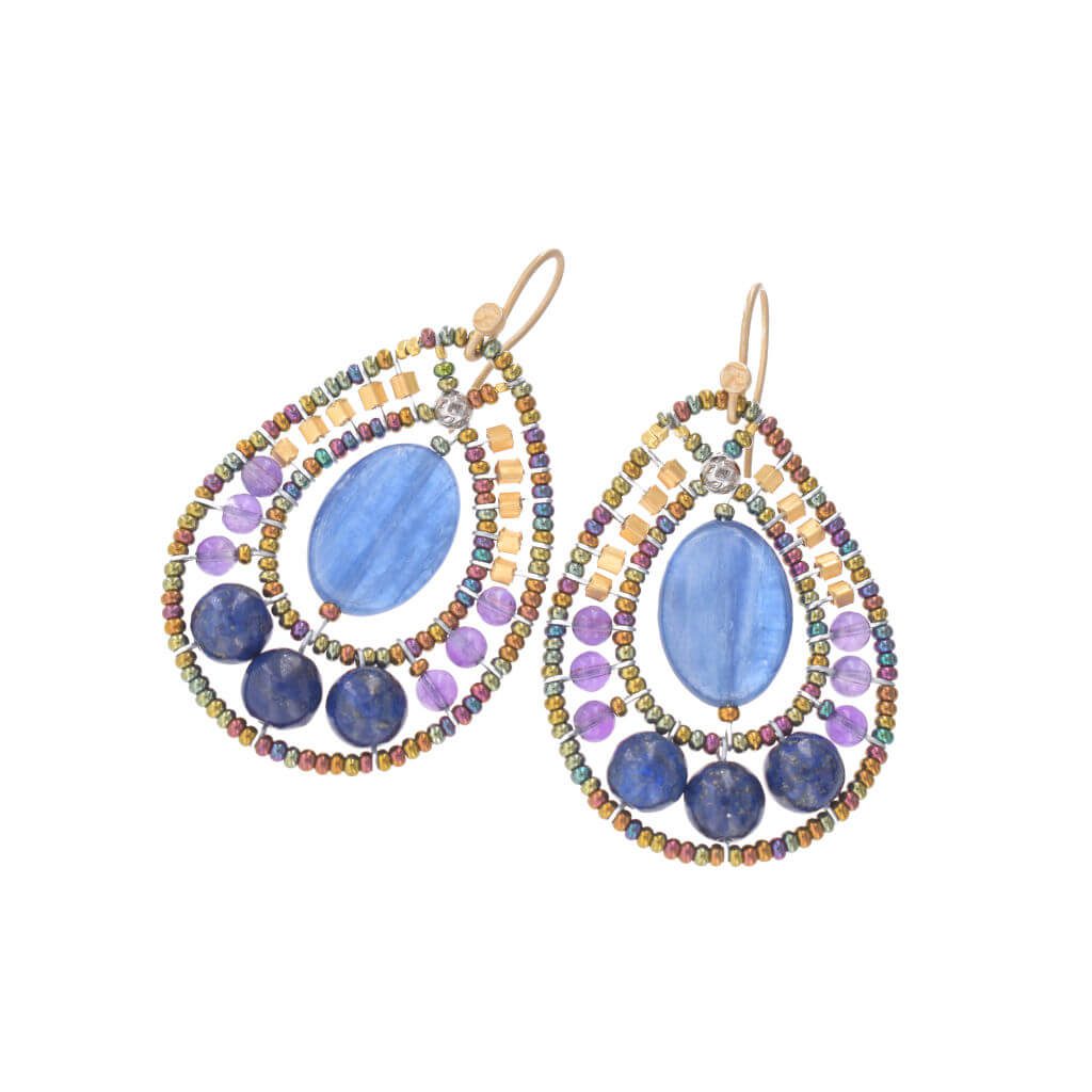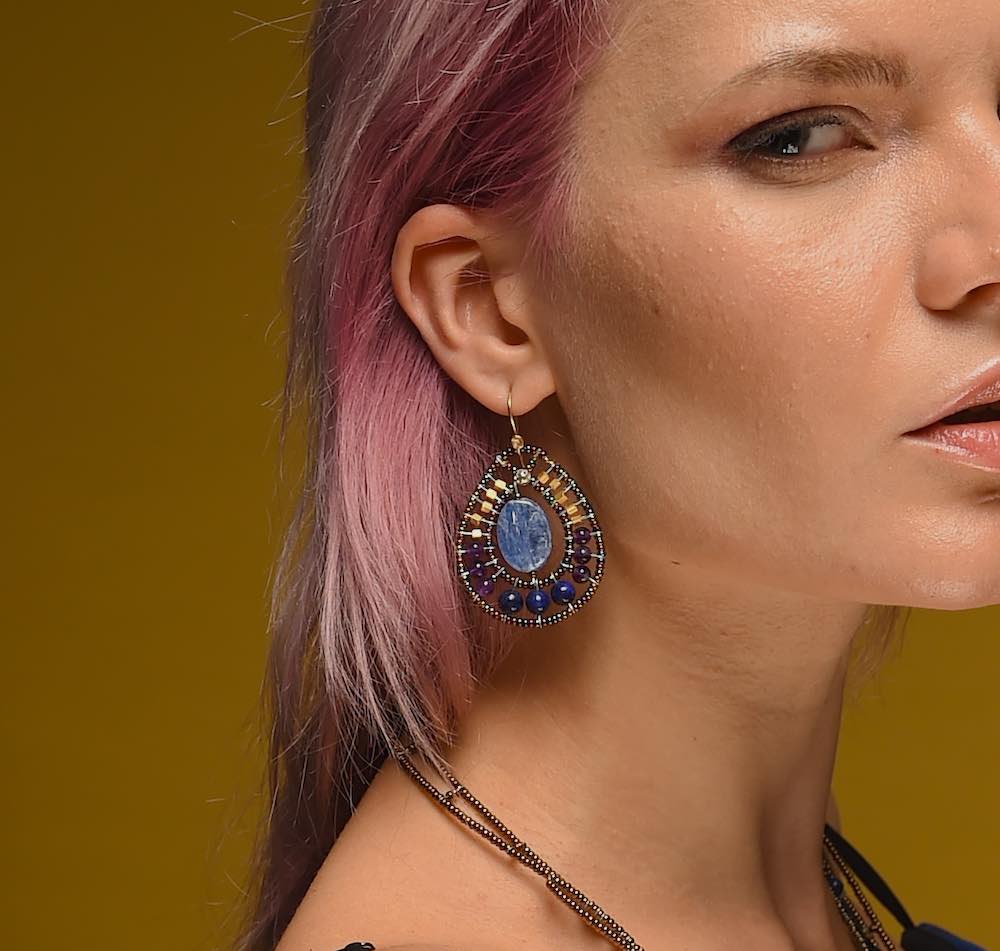 The Rock Kyanite earrings feature an oval Kyanite stone with three round blue onyx beads. On each side, there are three Murano glass beads which enhance the contrast. On top, small silver pearls are next to our slim gold-plated hook with the Ziio logo. The handmade rock kyanite earrings are 5.8 cm long. Composition: Amethyst, Gold-plated brass, Kyanite, Lapis lazuli, Murano glass pearls, 925 silver. Original, Authentic, Artisan. “Ziio is as unique as every woman who wears it”