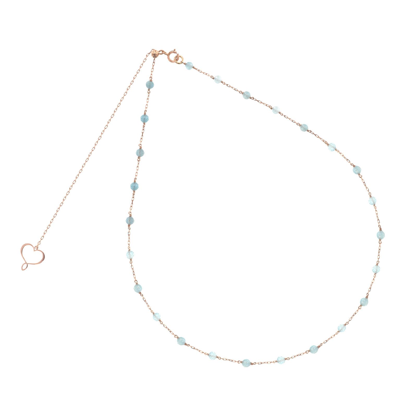 Girocollo Aurum realizzato in oro 18 carati con catena e pietre di Acquamarina di diametro 3 mm. La circonferenza del girocollo può essere regolata da un minimo di 31 cm fino ad un massimo di 40 cm. Chiusura con anello a molla. Significato della pietra. Secondo una leggenda, l’Acquamarina è ritenuta la pietra dei marinai e dei viaggiatori, secondo altre, invece, è propiziatrice di matrimoni felici. Sarebbe consigliabile quindi, donare questa pietra il giorno delle nozze. Alcune tonalità di colore dell’Acquamarina ricordano quelle del cielo, ed essendo questo considerato fonte d’illuminazione si pensa che la pietra possa confortare e dare speranza a colui che attraversa momenti dolorosi della sua vita. Nota: Le pietre impiegate per i gioielli Aurum, sono naturali. Per questo motivo potrebbero variare nelle sfumature.