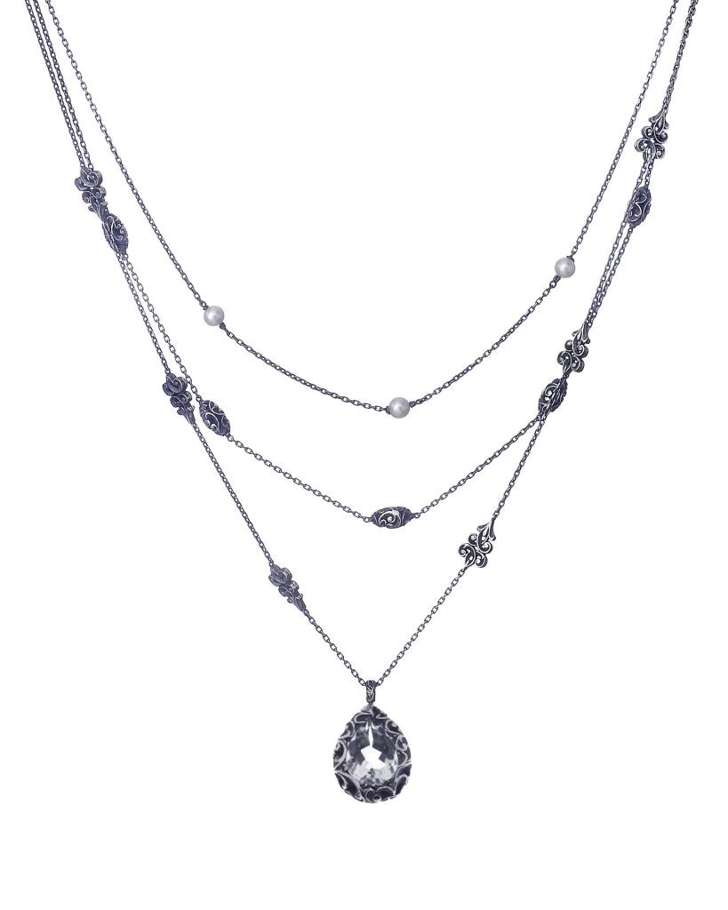 Collana Tre Fili a Scalare. Primo Filo Con Perle, Secondo con Shiva Lingam e Terzo con Elementi Intarsiati. Pietra a Goccia Pendente.