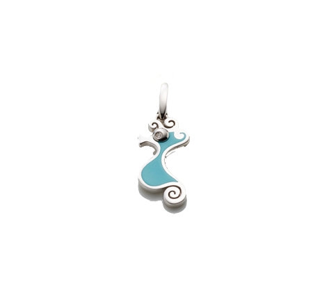 Ciondolo piccolo cavalluccio in argento e smalto azzurro, occhi con diamante e biglierina apribile con cordino colorato.