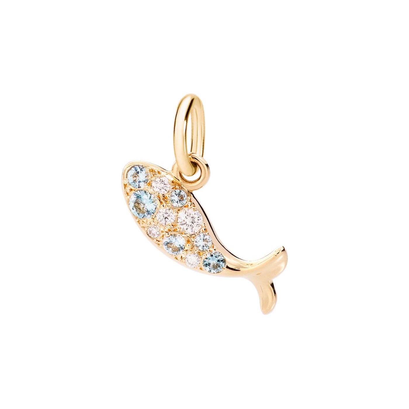 Ciondoo fish in 18K yellow gold, white diamonds and blue sapphires.