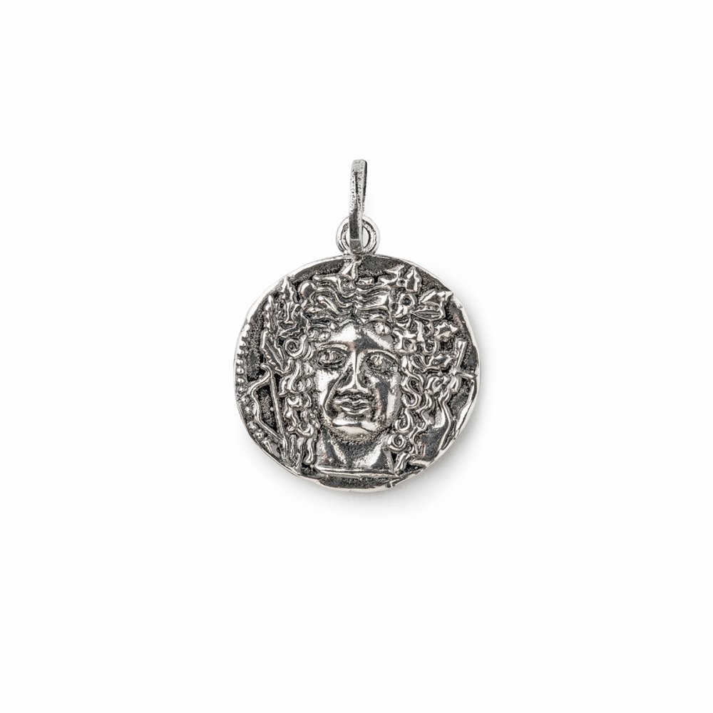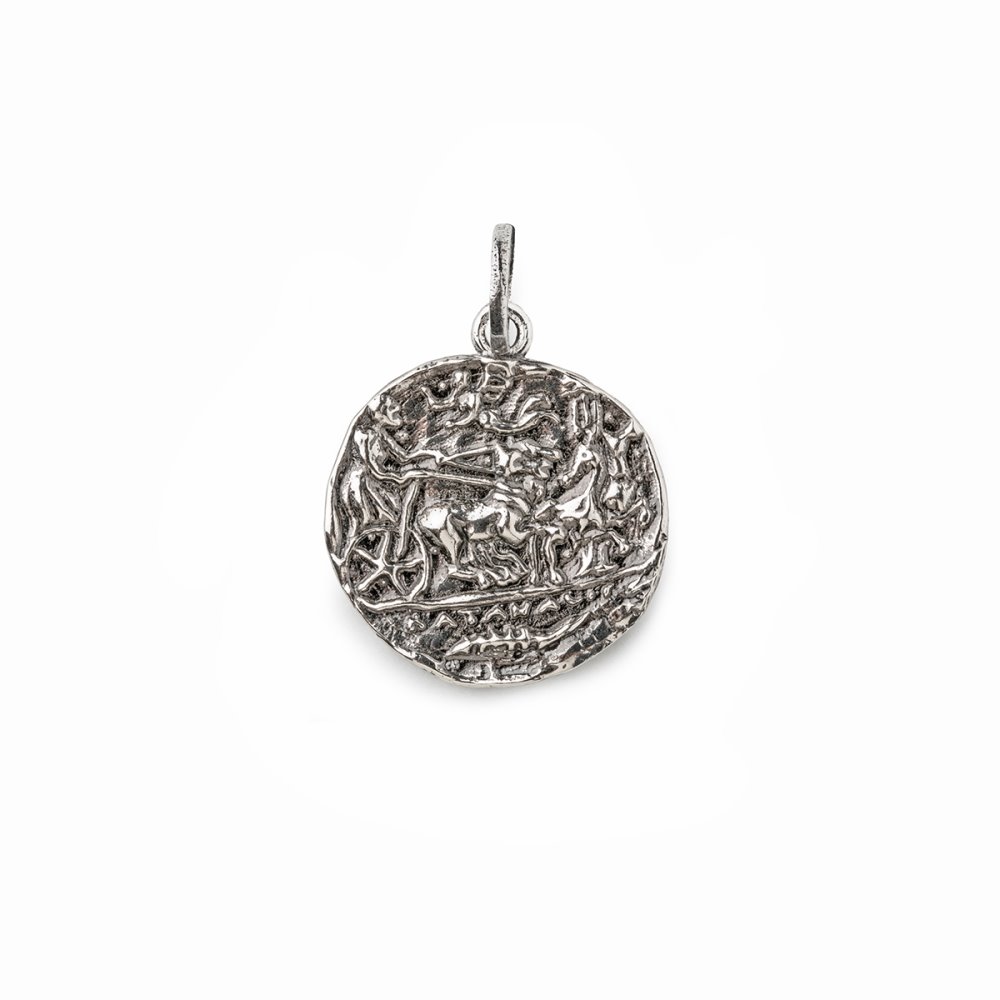 A period of splendor and artistic freshness from which to start again: a collection of charms that recall the ancient Greek tradition of double-faced coins, small sculptures made by hand as in the past. Inspired by the original subjects of a coin from the end of the 5th century BC, a jewel depicting the head of Apollo with a garland and, on the other top, a charioteer with a quadriga, Nike holding a crown and, below, the name of the province KATANAION Charm in 925 sterling silver, ruthenium plated. Code 20001120