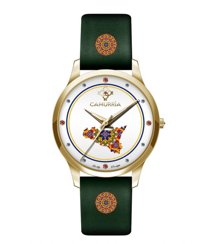 Sicily is the main subject of the Glamor watch from the Sicilia Bedda collection in its Gold version. A metal watch with a polished finish and Sicily on the dial and leather strap. REFERENCE CW32GT1