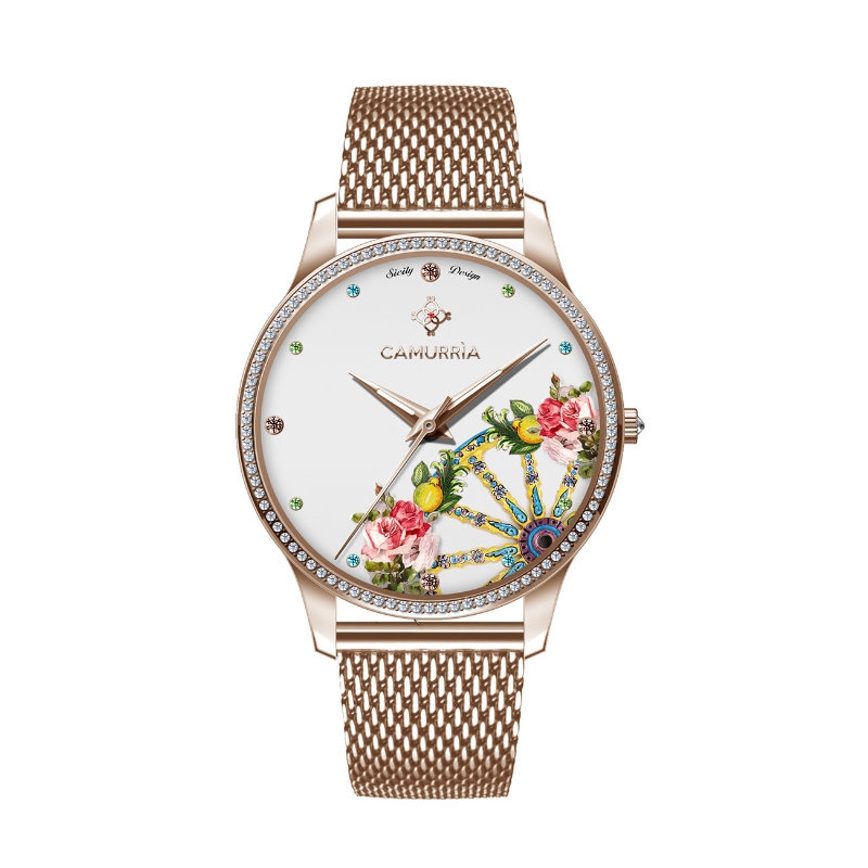 37mm shiny rosegold case and rhinestones with stones also applied to the dial, Cart Wheel and roses print. Rosegold Milanese mesh steel strap. The Camurria CW22RS1 watch comes complete with case and 2-year warranty certificate, valid at any authorized service centre. REFERENCE CW22RS1
