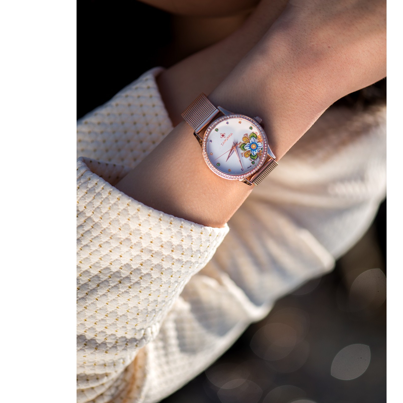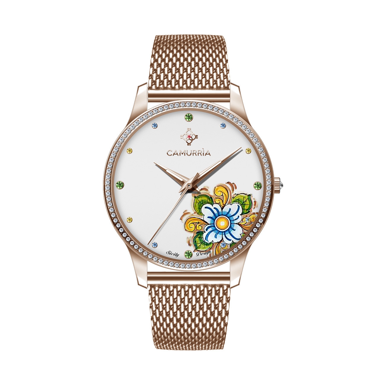 Orologio Milano con quadrante con pietre e bracciale in acciaio lucido milanese rosegold. Un orologio con la ricercata stampa delle maioliche "M'ama non m'ama"; il regalo ideale per una donna romantica.