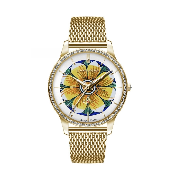 Orologio Milano, della collezione I Maioliche, con bracciale in acciaio lucido milanese abbinato alla cassa in metallo. Un orologio impreziosito da pietre applicate e girasole stampato sul quadrante.