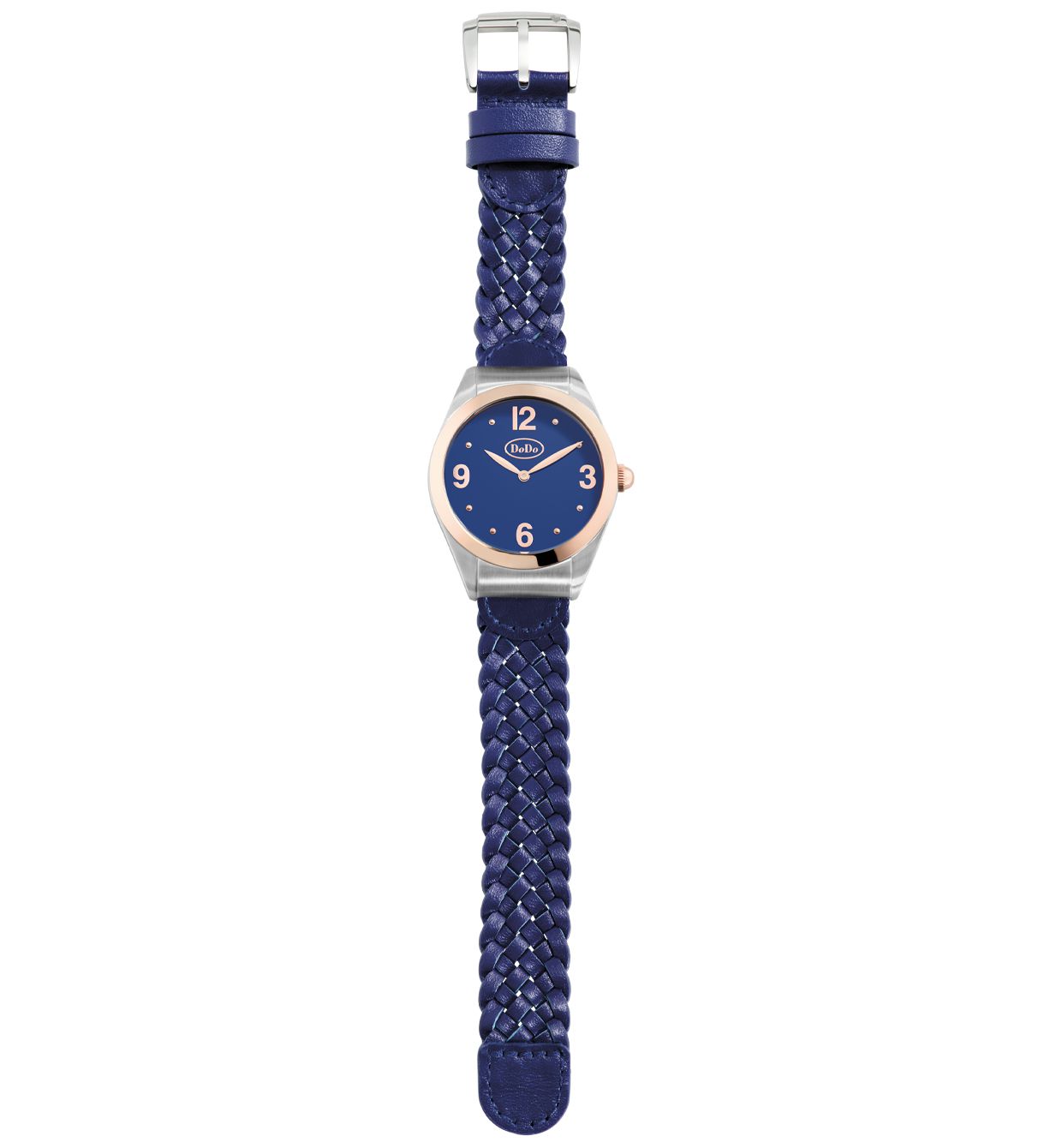 Cinturino in pelle intrecciata blu inchiostro con fibbia in acciaio lucido.
