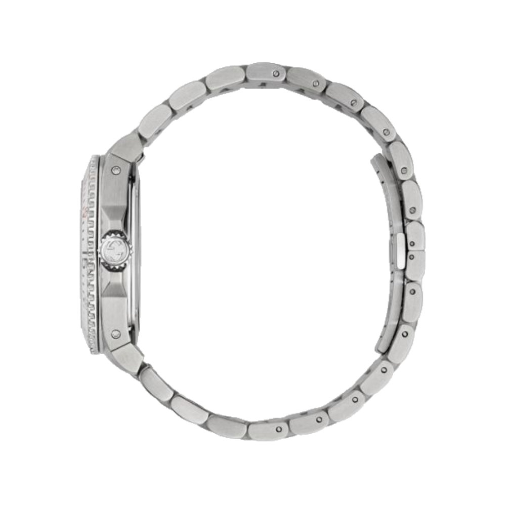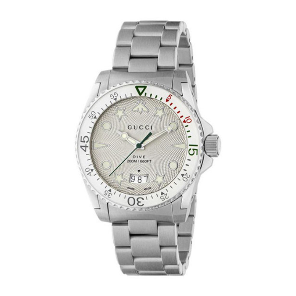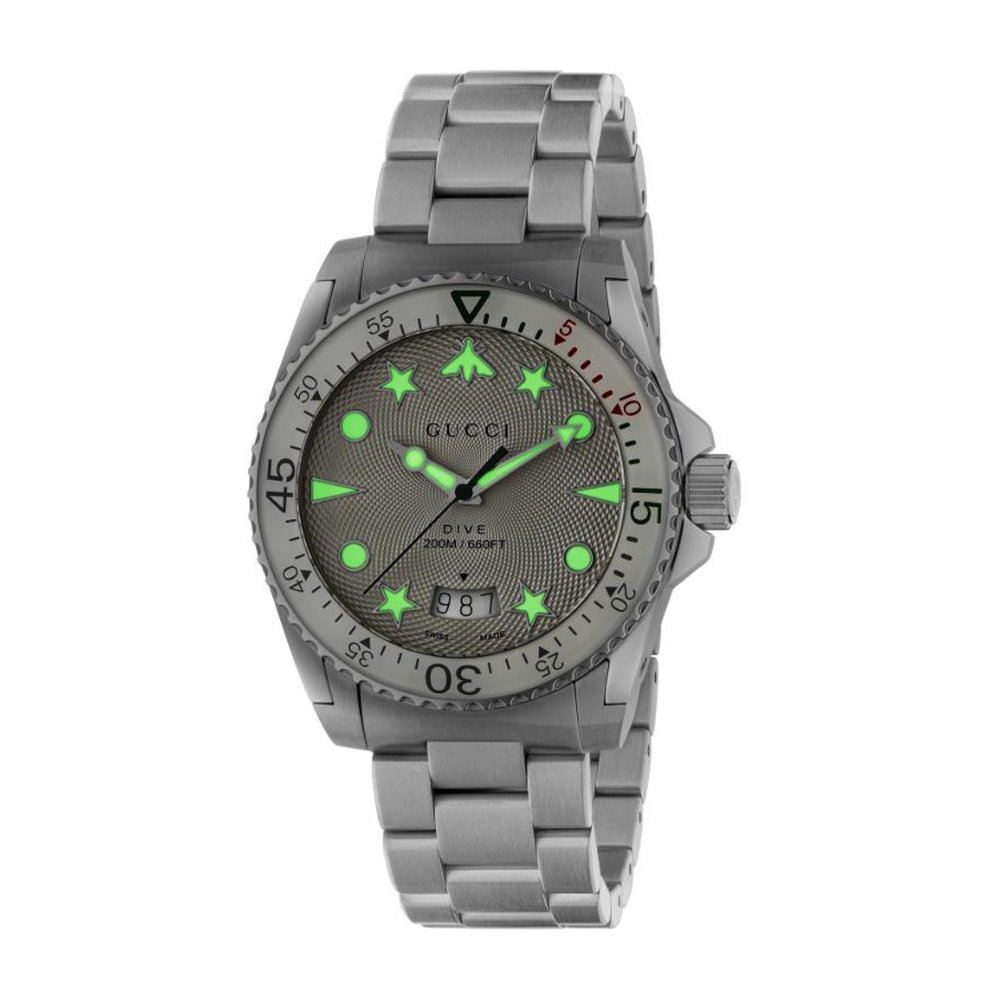 Lancette e indici luminescenti. Datario a ore 6. Movimento al quarzo.