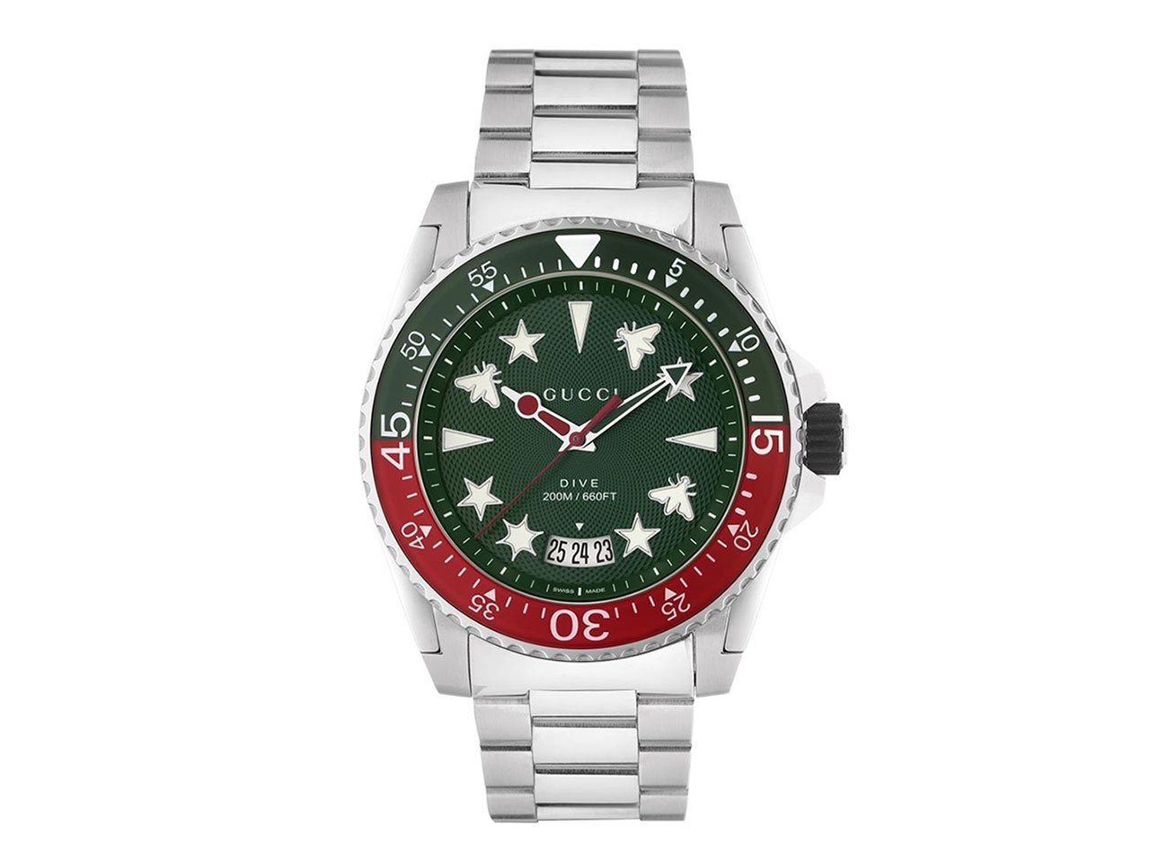 Con un design dotato degli elementi caratteristici di un orologio per immersioni, questo modello Gucci Dive dall'allure contemporanea è caratterizzato da una cassa e bracciale in acciaio, lunetta verde e rossa e corona in gomma verde,