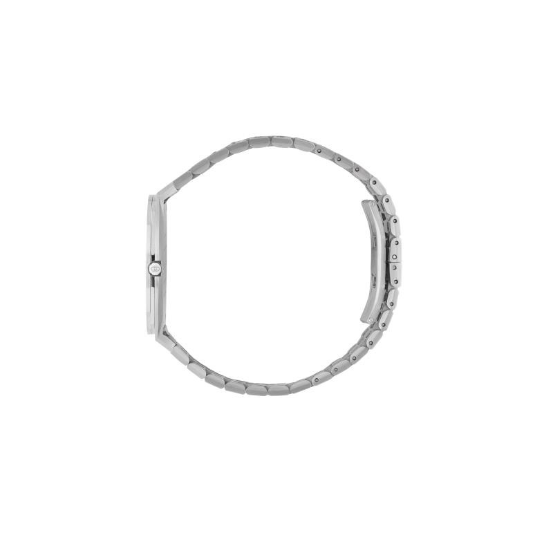 Cassa sfaccettata di 38 mm in acciaio inossidabile, quadrante in ottone color argento con motivo GG, cinturino in acciaio inossidabile a cinque maglie