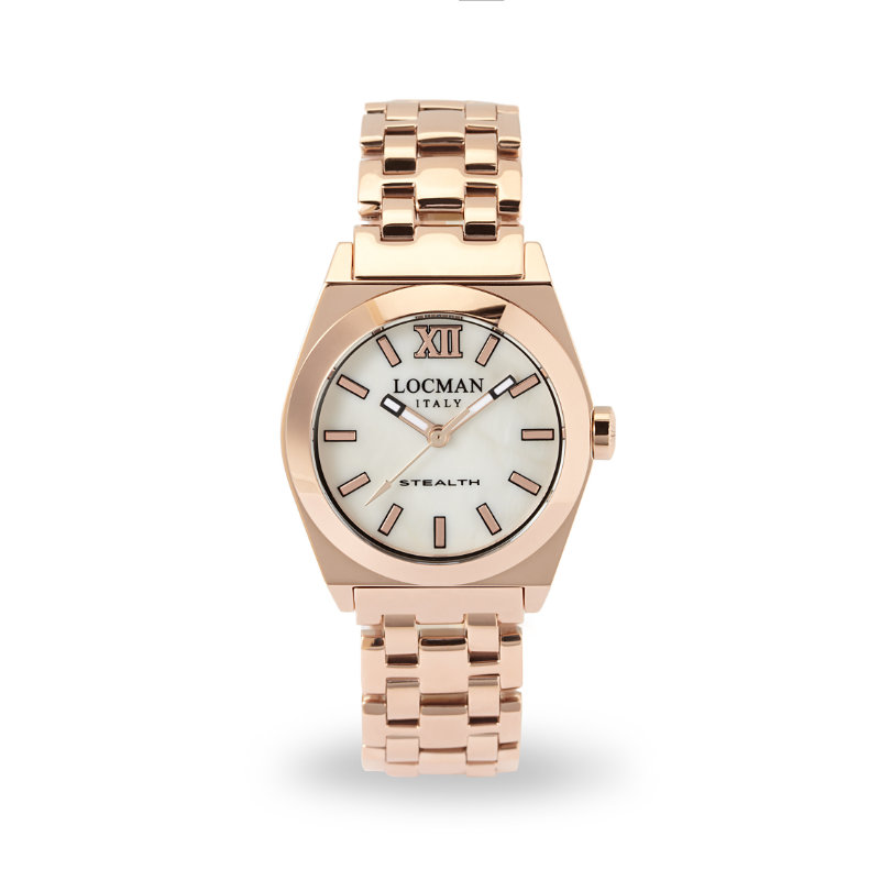 Orologio con cassa in acciaio e titanio con trattamento pvd della dimensione di 32 mm e misto di numeri romani e indici applicati. Cinturino in acciaio pvd della larghezza di 18mm.