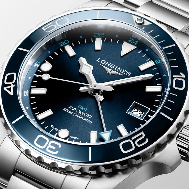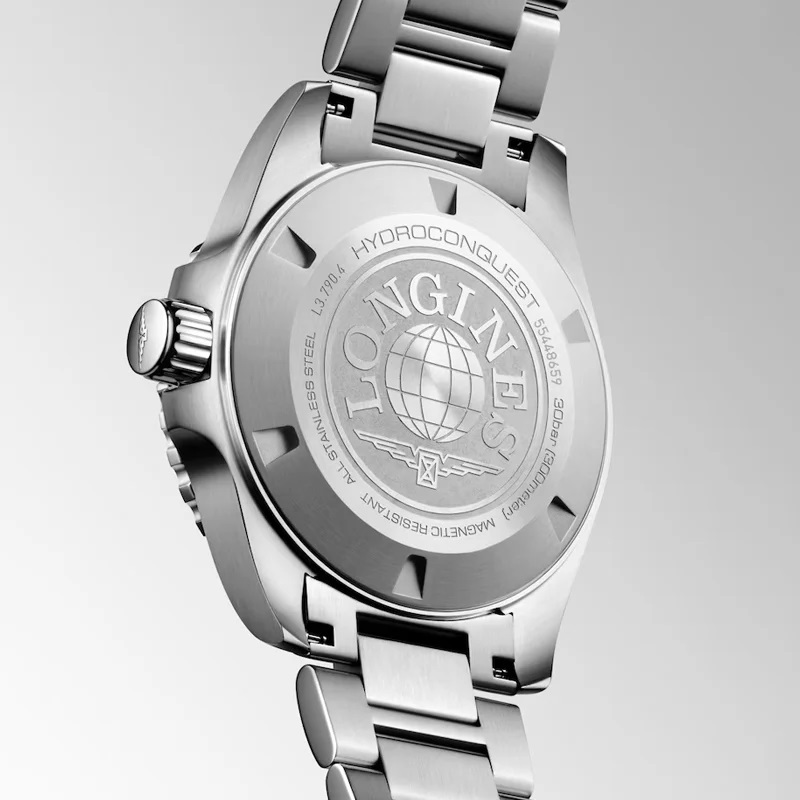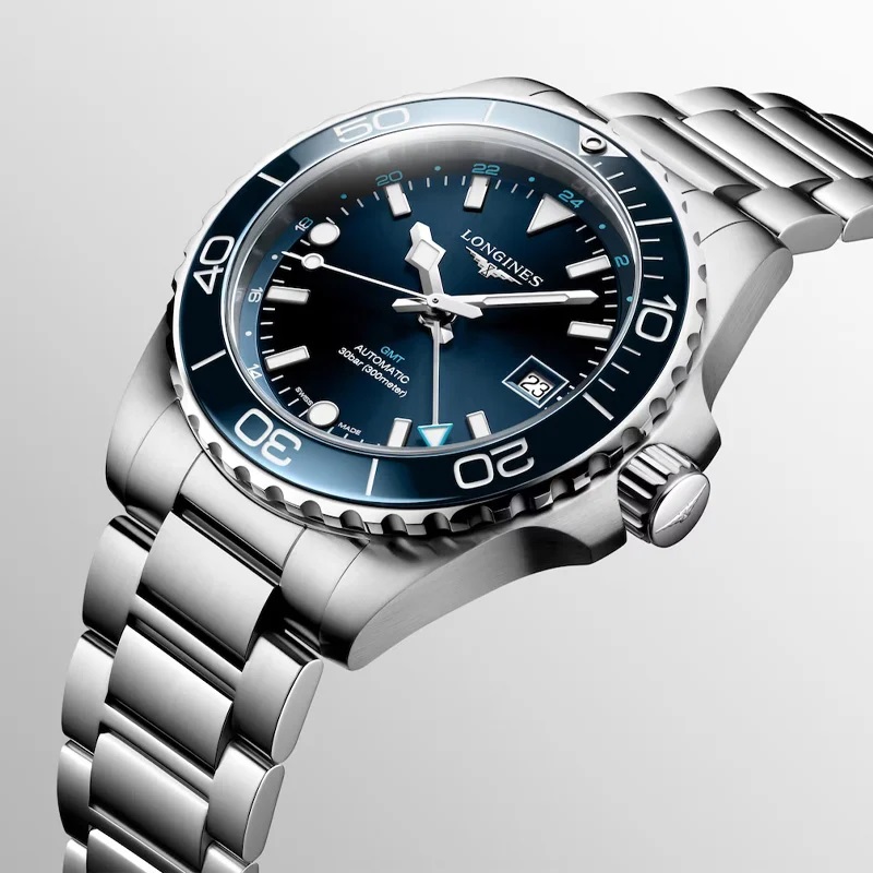 L'HydroConquest GMT si distingue anche per la cassa in acciaio inossidabile da 41 mm con fondello e corona avvitati.