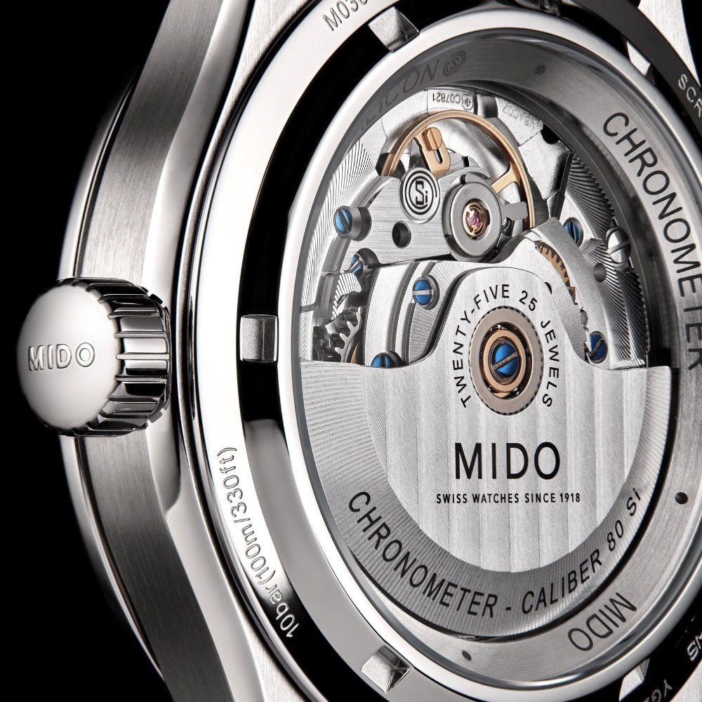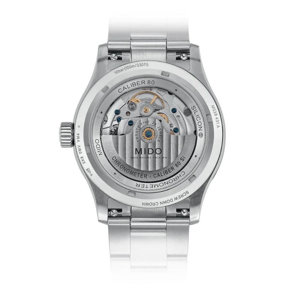 The Multifort M chronometer with movement tested and certified by the COSC (Contrôle Officiel Suisse des Chronomètres). This model stands out for its exceptional quality, well beyond the standards. Its Caliber 80, with a power reserve of up to 80 hours, is equipped with a silicon hairspring, an unflappable factor of precision. The characteristic round indexes, coated with beige Super-LumiNova®, offer optimal readability against the darker, satin-finished and graduated background. Waterproof up to 100 m and equipped with a bracelet that offers the convenience of changing with a click, without tools." Brand Mido Multifort Collection Automatic Movement Color Green Dial Glass Sapphire Glass Water Resistance 10 ATM Case Material Steel Bezel Material Steel Fold Clasp Closure Gender Man Warranty 2 Years Thickness 12 Functions Watch Date Numerals Arabic Numerals Automatic Caliber Mido Caliber 80 Power Reserve 80 hours