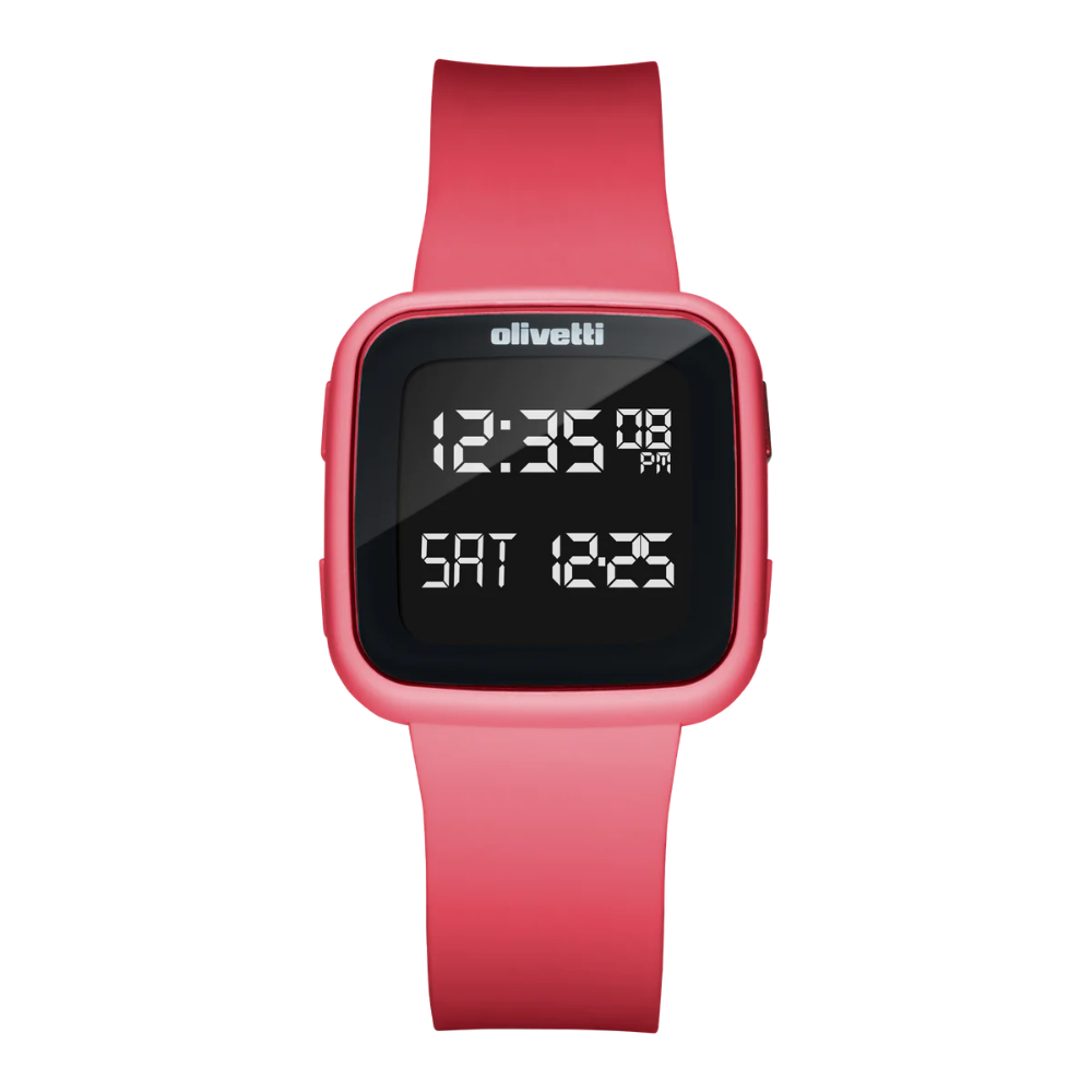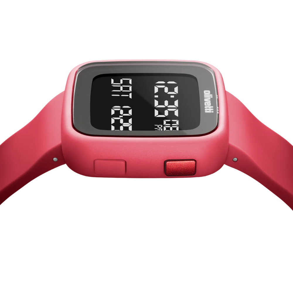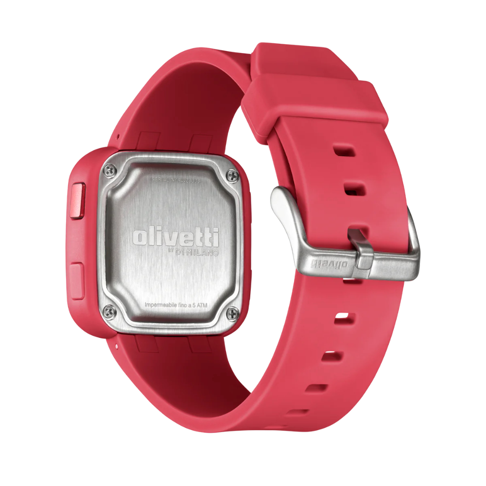 Olivetti by D1 Milano was born from the union of two brands that share a single value: uncompromising design and attention to detail. The new collection features six new models inspired by Olivetti's most iconic typewriters. Case Size 36mm x 11.1mm Case Material Red Polycarbonate Strap Red Silicone Clasp Stainless Steel Bezel Red Polycarbonate Case Back Stainless Steel Dial Black Dial with LCD Screen Hands & Indexes Digital Glass Mineral Glass Movement CLV 283 Water Resistance & Weight 5ATM,42g SKU code OL-OLRJ04