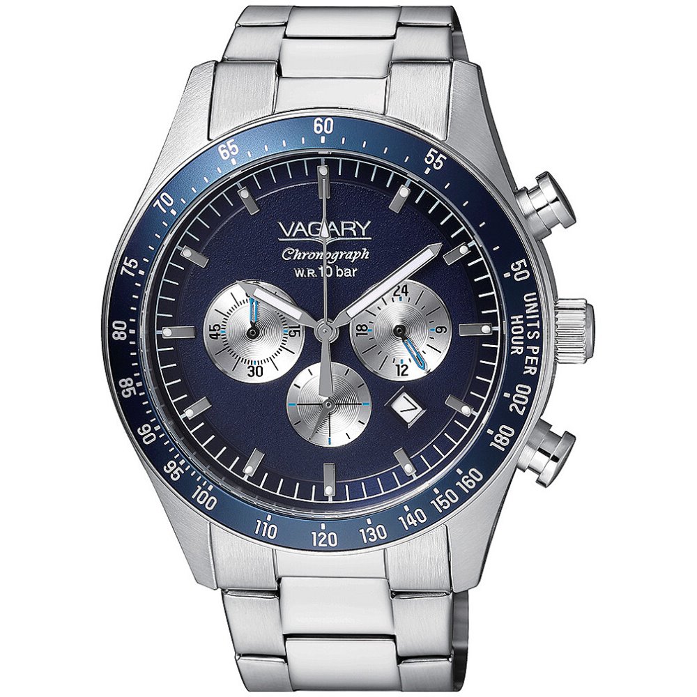 Vagary men's chronograph watch from the Rockwell collection. Model with steel case with screw back with a diameter of 42 mm, blue dial with applied indexes and mineral glass. The bracelet is made of steel with a push-button clasp. Watch with 10 atm water resistance, citizen quartz movement. Caliber 0510 and date display. The reference is IV4-012-71