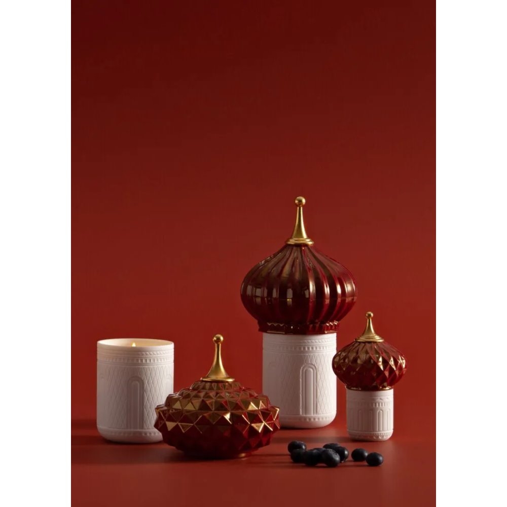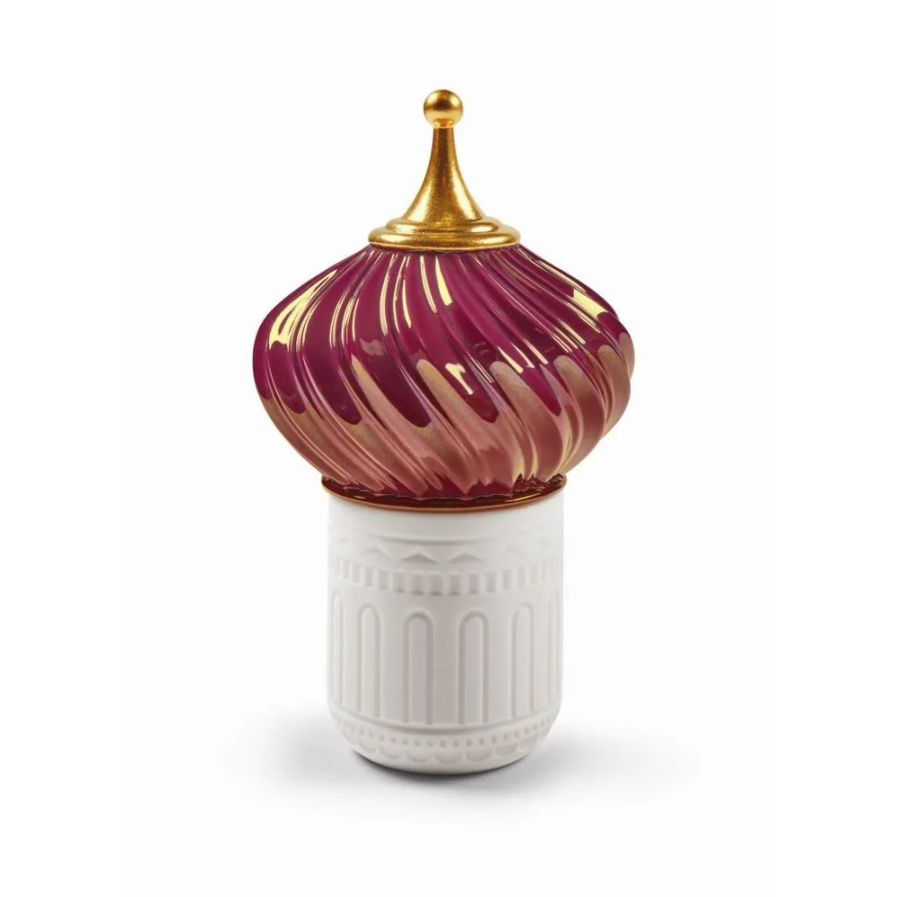 Candela profumata il cui disegno riproduce una torre, con contenitore in porcellana traslucida e coperchio in smalto rosso e oro.