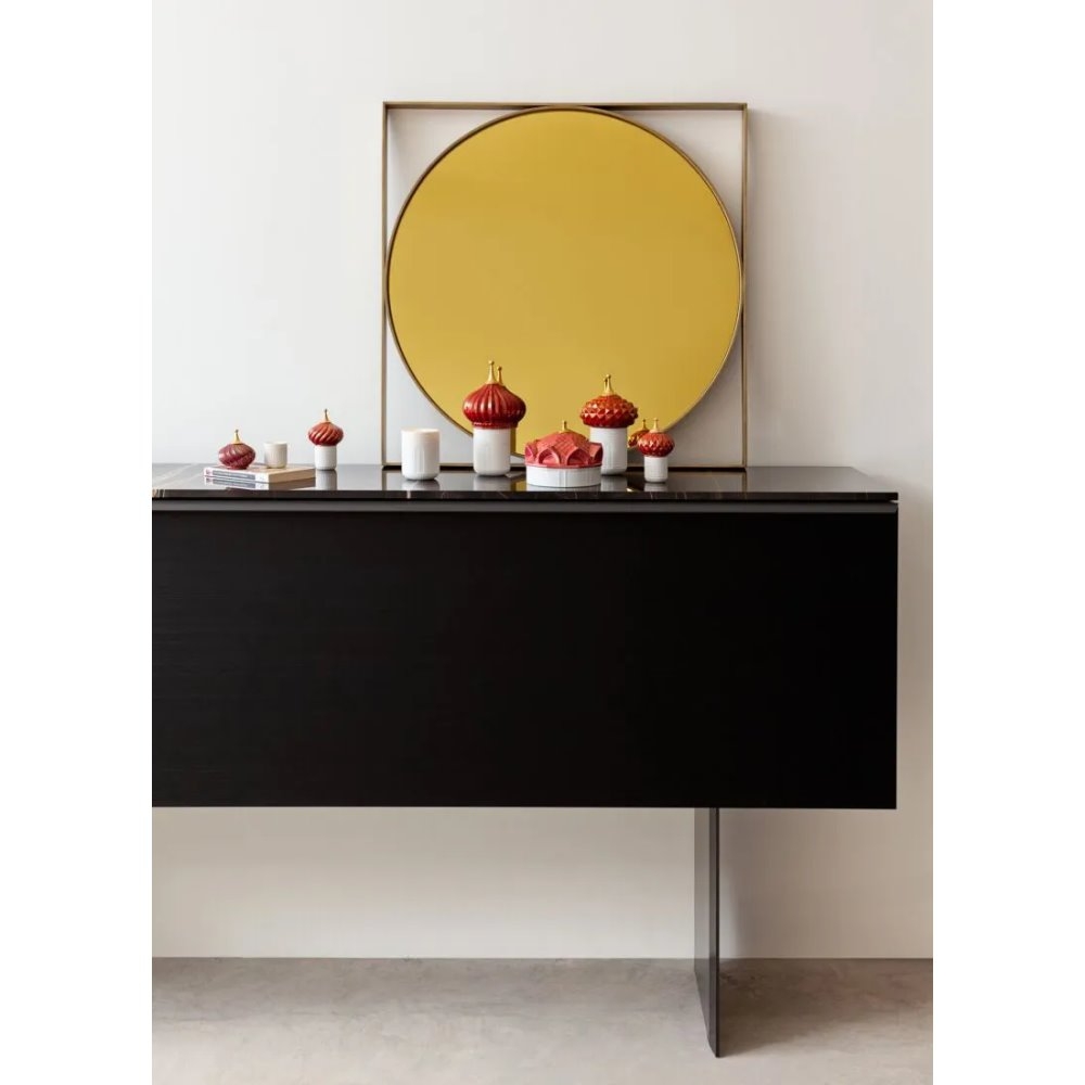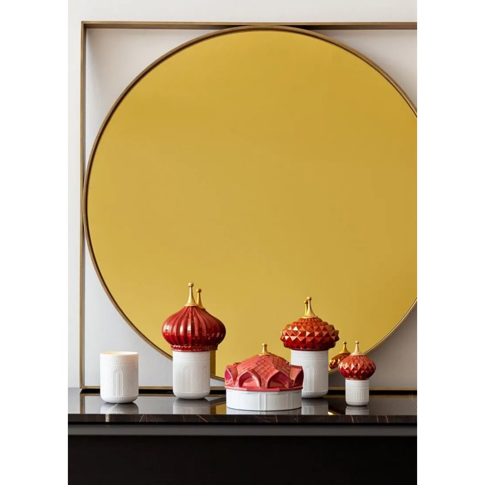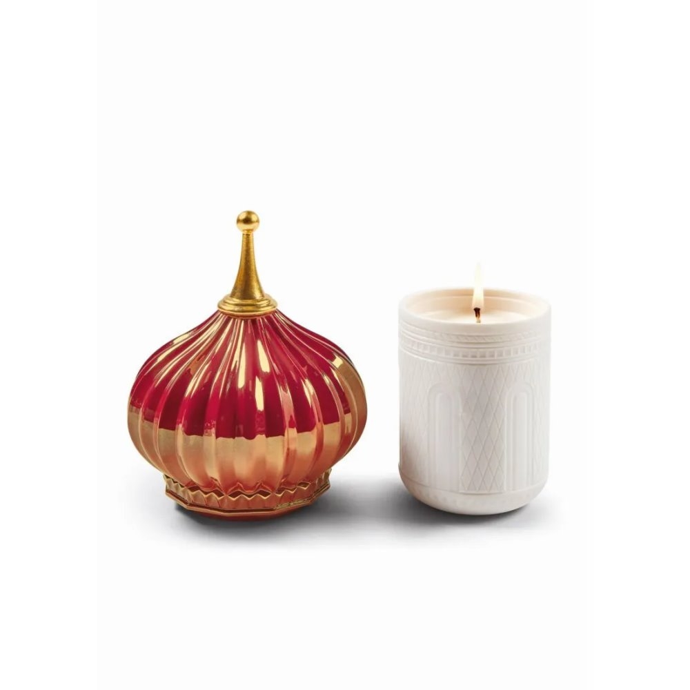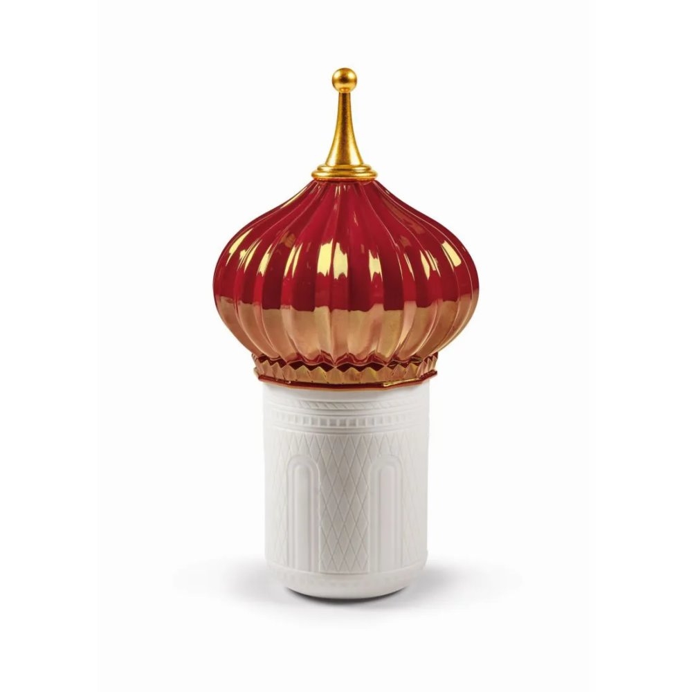 Candela profumata il cui disegno riproduce una torre, con contenitore in porcellana traslucida e coperchio in smalto rosso e oro.