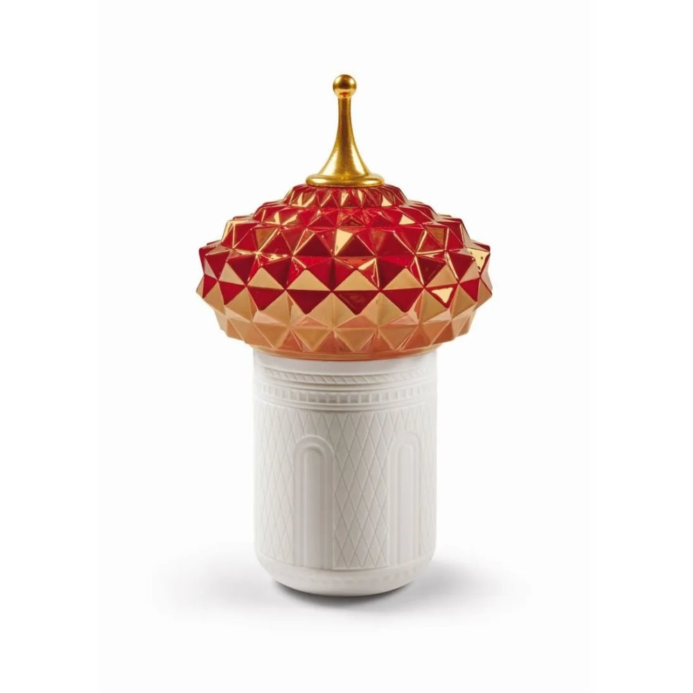 Candela profumata il cui disegno riproduce una torre, con contenitore in porcellana traslucida e coperchio in smalto rosso e oro.