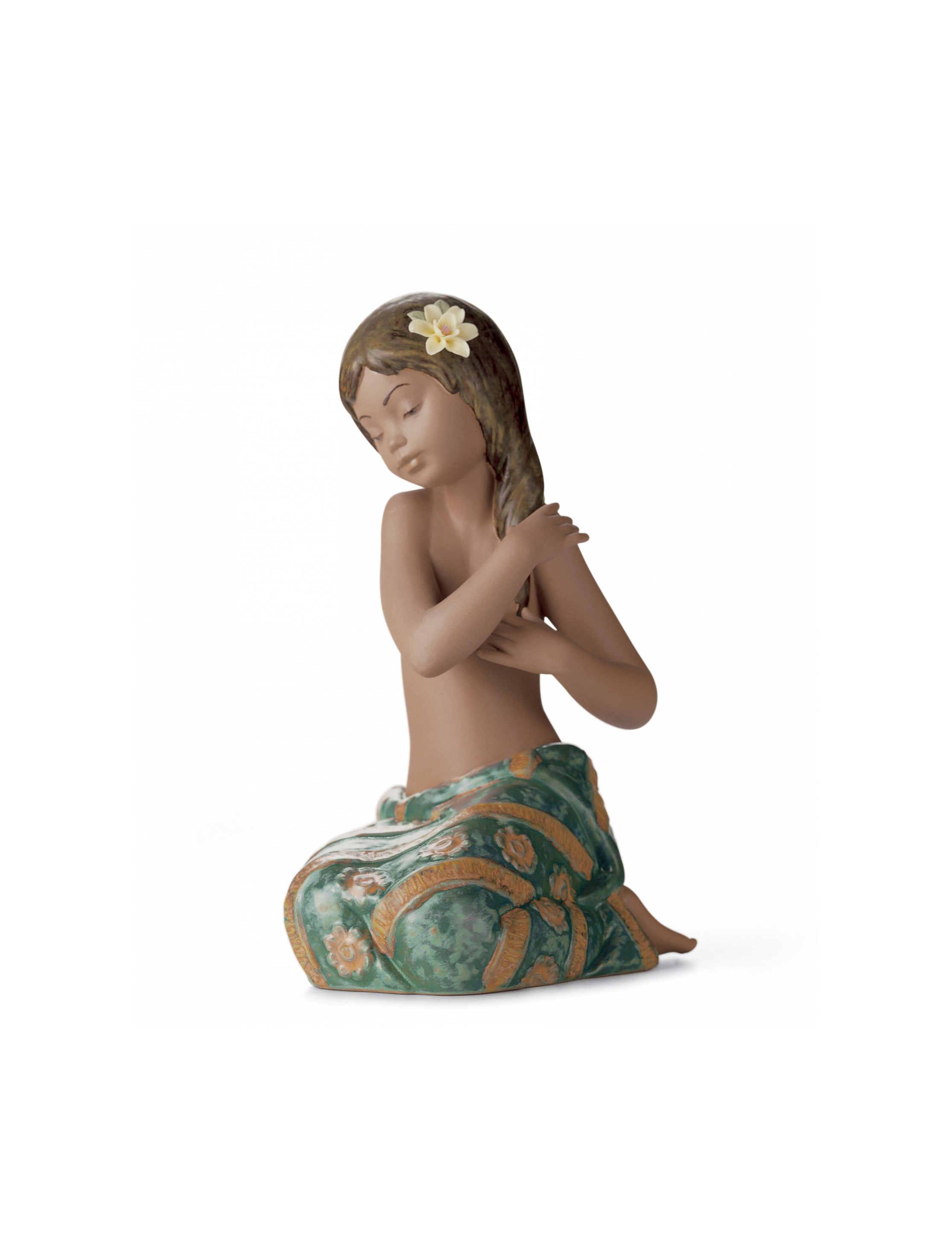 Figura di porcellana in gres porcellanato seduta a contatto con i capelli con il fiore in testa e il pareo decorato con smalti nei toni del verde e dell'ocra.