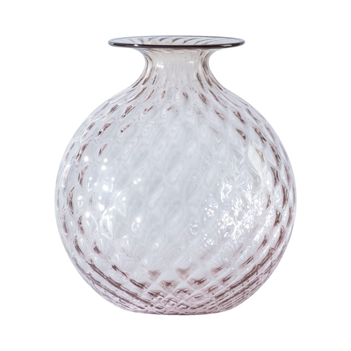 Sembra morbido, eppure è vetro. L'illusione ottica del monofiori di venini del 1970 è nel suo nome: balloton, la lavorazione unica che ricrea sulla superficie l'effetto matelassé. L'opera è lavorata a mano, soffiata nel caratteristico stampo in metallo e finita nel collo sottile con un filo colorato applicato a caldo, che varia nel colore.