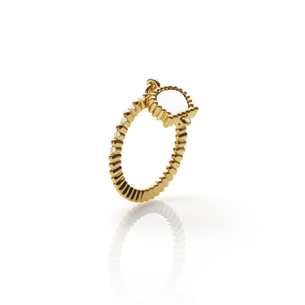 Anello in oro giallo 18 kt e diamanti, con campanella in Kogolong e Diamante